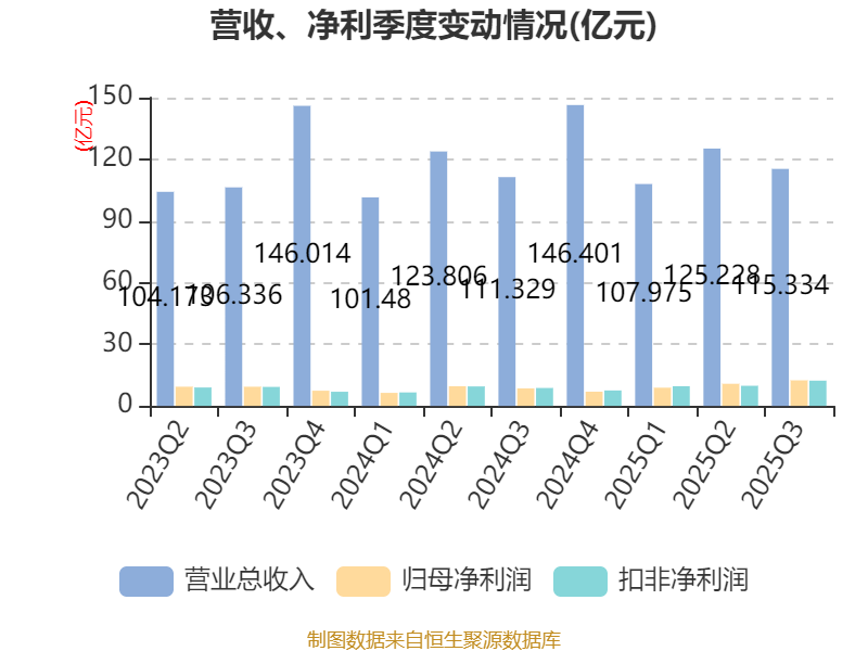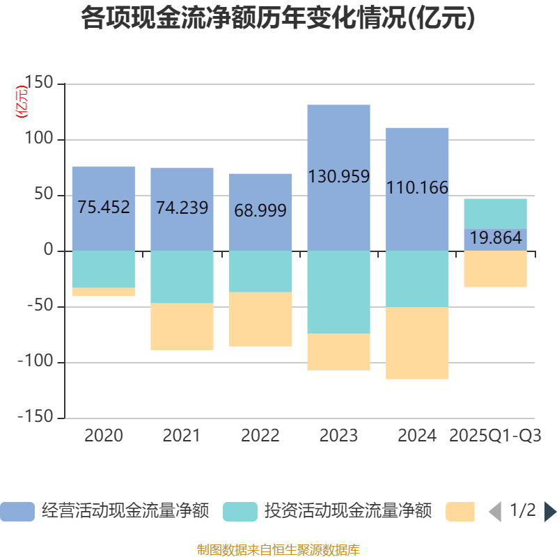 2025年前三季度,公司经营活动现金流净额为19.86亿元,同比下降61.19%;筹资活动现金流净额-32.75亿元,同比增加11.88亿元;投资活动现金流净额26.7亿元,上年同期为17.14亿元。