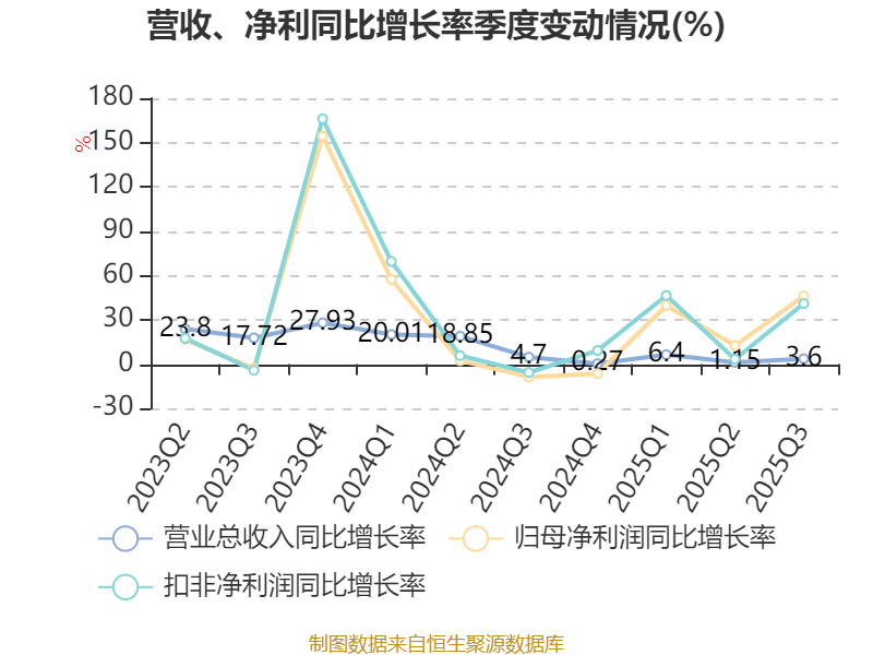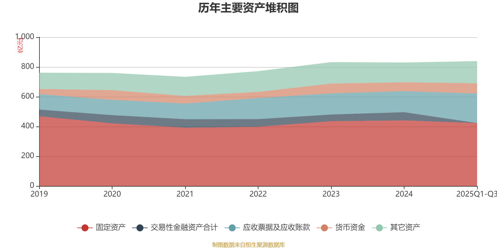 资产重大变化方面,截至2025年三季度末,公司应收票据及应收账款较上年末增加40.89%,占公司总资产比重上升6.68个百分点;交易性金融资产合计较上年末减少100%,占公司总资产比重下降6.63个百分点;固定资产较上年末减少4.09%,占公司总资产比重下降2.75个百分点;货币资金较上年末增加14.76%,占公司总资产比重上升0.97个百分点。
