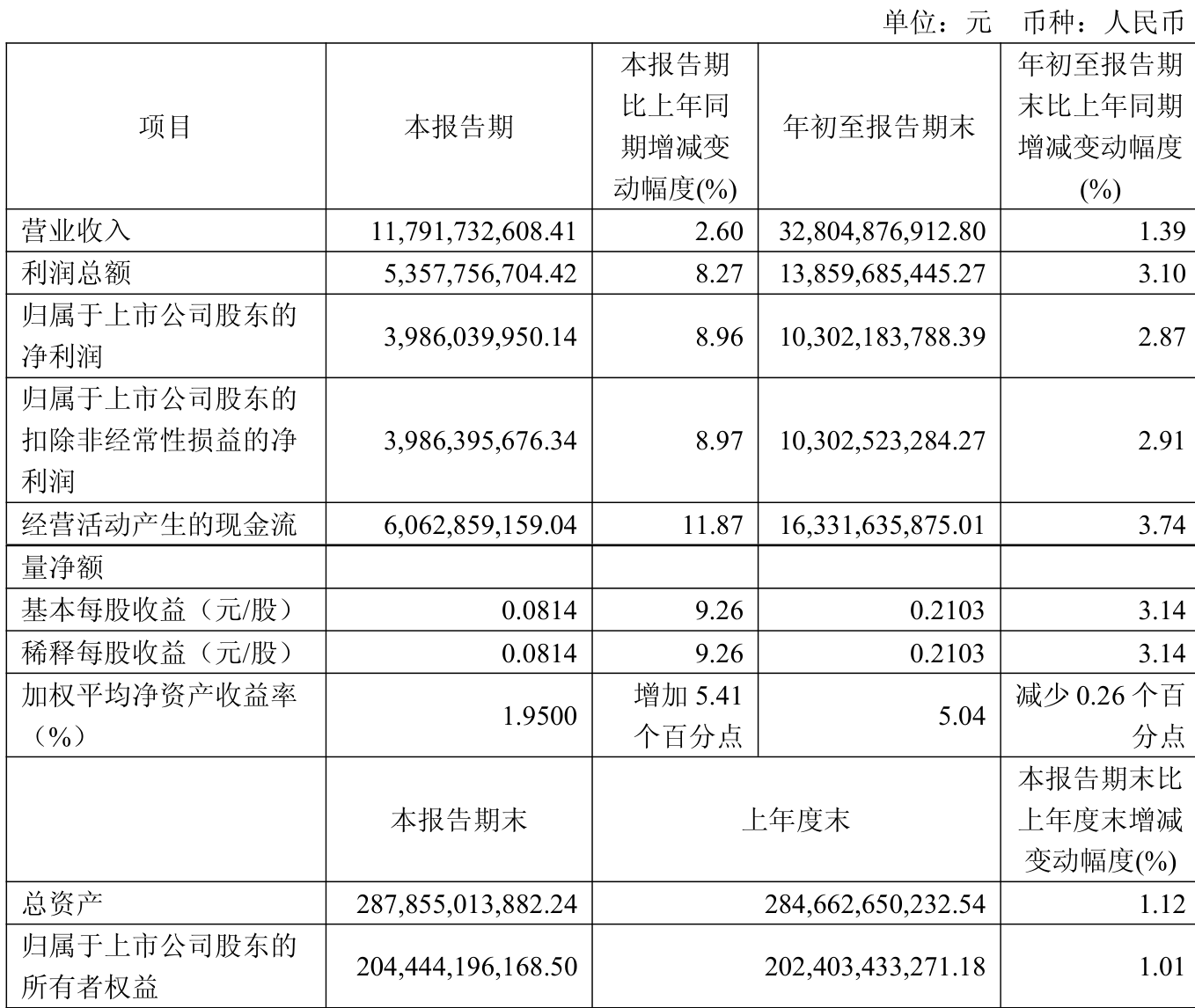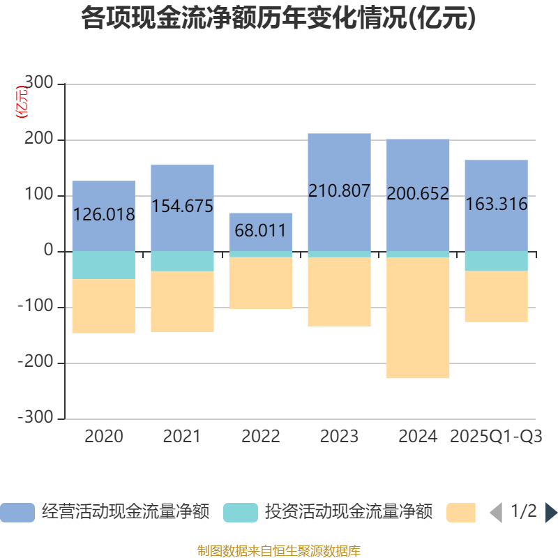 2025年前三季度,公司经营活动现金流净额为163.32亿元,同比增长3.74%;筹资活动现金流净额-91.46亿元,同比增加114.62亿元;投资活动现金流净额-35.77亿元,上年同期为-5.41亿元。