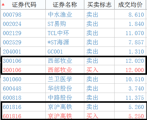 出现重大BUG,感觉受到重大挫败。黑框两个股票,在开盘未达预期条件的情况下,自动卖出。更严重的问题是,601816京沪高铁卖出时还赔钱,说明程序有重大隐患BUG,目前没有查出原因,将继续重点关注程序运行情况。两个买入是发现程序有问题后,手动第一时间补回的。