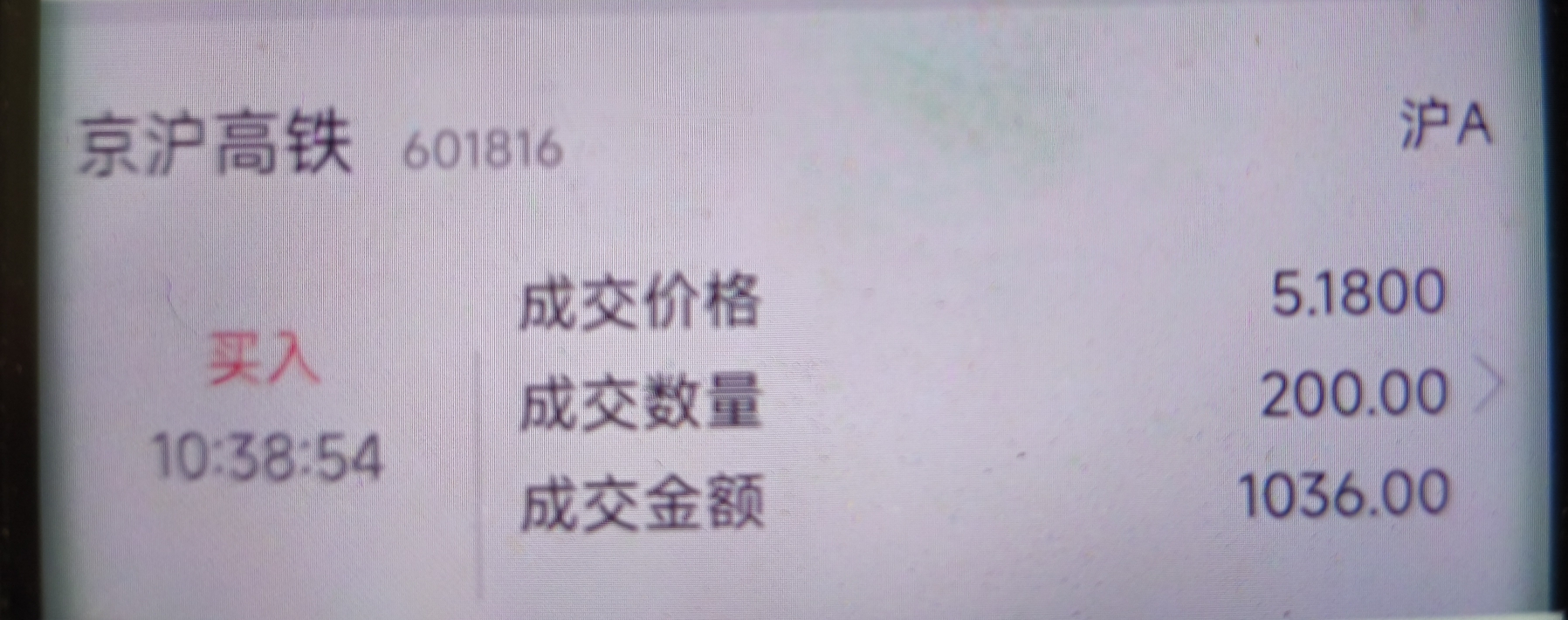 最近捡来的废品卖掉所累积的200元,加上自己再贴出点养老钱,刚买了200股京沪高