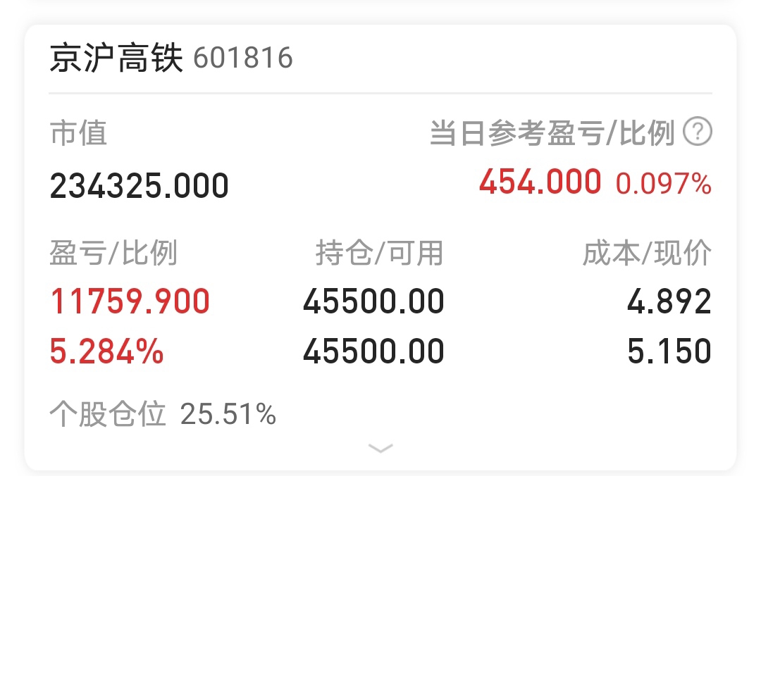 $京沪高铁(SH601816)$ 自从第一次购买京沪高铁以来,该股总体是向下趋势,如果不高抛低吸做T的话,那一定会被套住。在目前的情况下,象这种大盘股要敢于做T(留有底仓),不怕会卖飞,要耐心等待到低点再大胆买入。