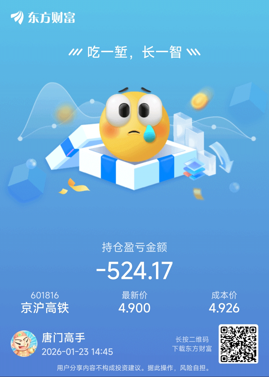 温馨提示: 1.根据《证券法》规定,禁止编造、传播虚假信息或者误导性信息,扰乱证券市场;2.用户在本社区发表的所有资料、言论等仅代表个人观点,与本网站立场无关,不对您构成任何投资建议。用户应基于自己的独立判断,自行决定证券投资并承担相应风险。《东方财富社区管理规定》