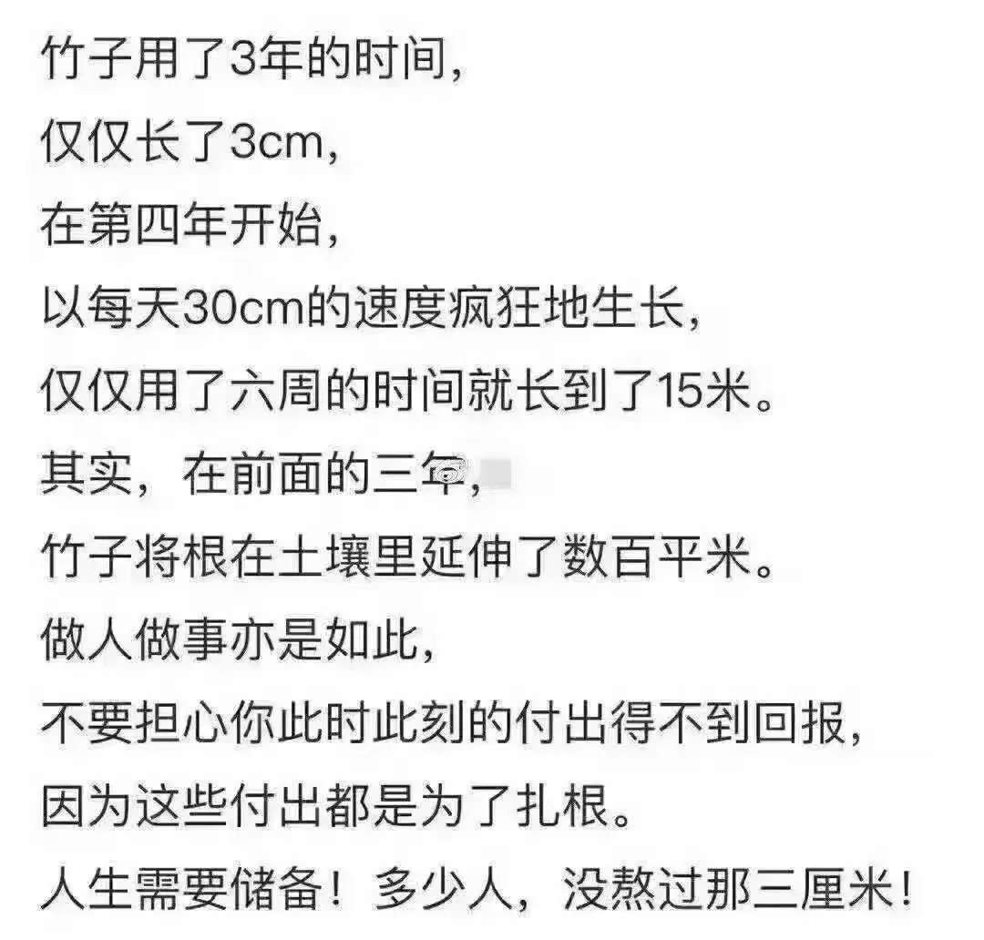 $京沪高铁(SH601816)$ 竹子前三年仅长3厘米,第四年每天长15厘米,6周长至15米。前三年它在扎根,启示人们要熬过积累期,厚积薄发。前期没什么感觉,增幅不大,但是在积累了一段时间后,你会发现越来越明显,后期爆发起来非常可观。