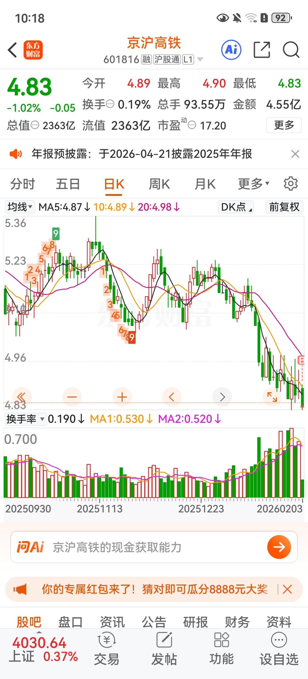 $京沪高铁(SH601816)$ 4.84建个底仓,年底前再加一次仓就持仓过年了