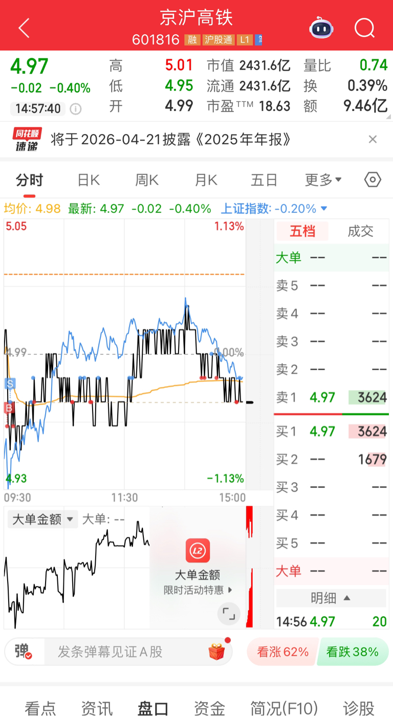 $京沪高铁(SH601816)$ 好险呀,下午卖飞了不少,得亏你又砸下来了,不错不错