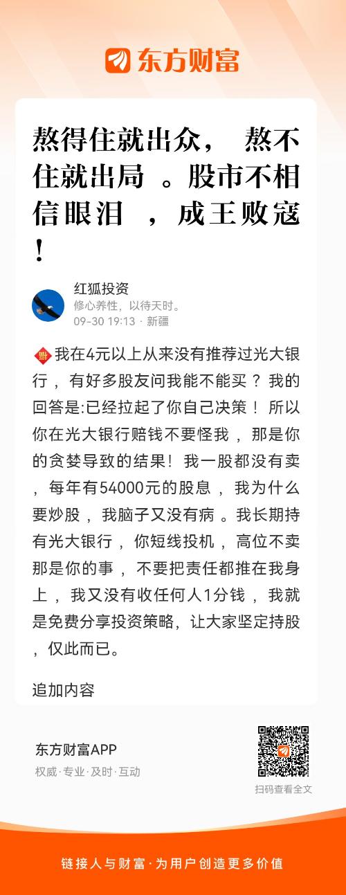 我在4元以上从来没有推荐过光大银行 ,有好多股友问我能不能买 ?我的回答是:已经拉起了你自己决策 !所以你在光大银行赔钱不要怪我 ,那是你的贪婪导致的结果!我一股都没有卖 ,每年有54000元的股息 ,我为什么要炒股 ,我脑子又没有病 。我长期持有光大银行 ,你短线投机 ,高位不卖那是你的事 ,不要把责任都推在我身上 ,我又没有收任何人1分钱 ,我就是免费分享投资策略,让大家坚定持股 ,仅此而已。