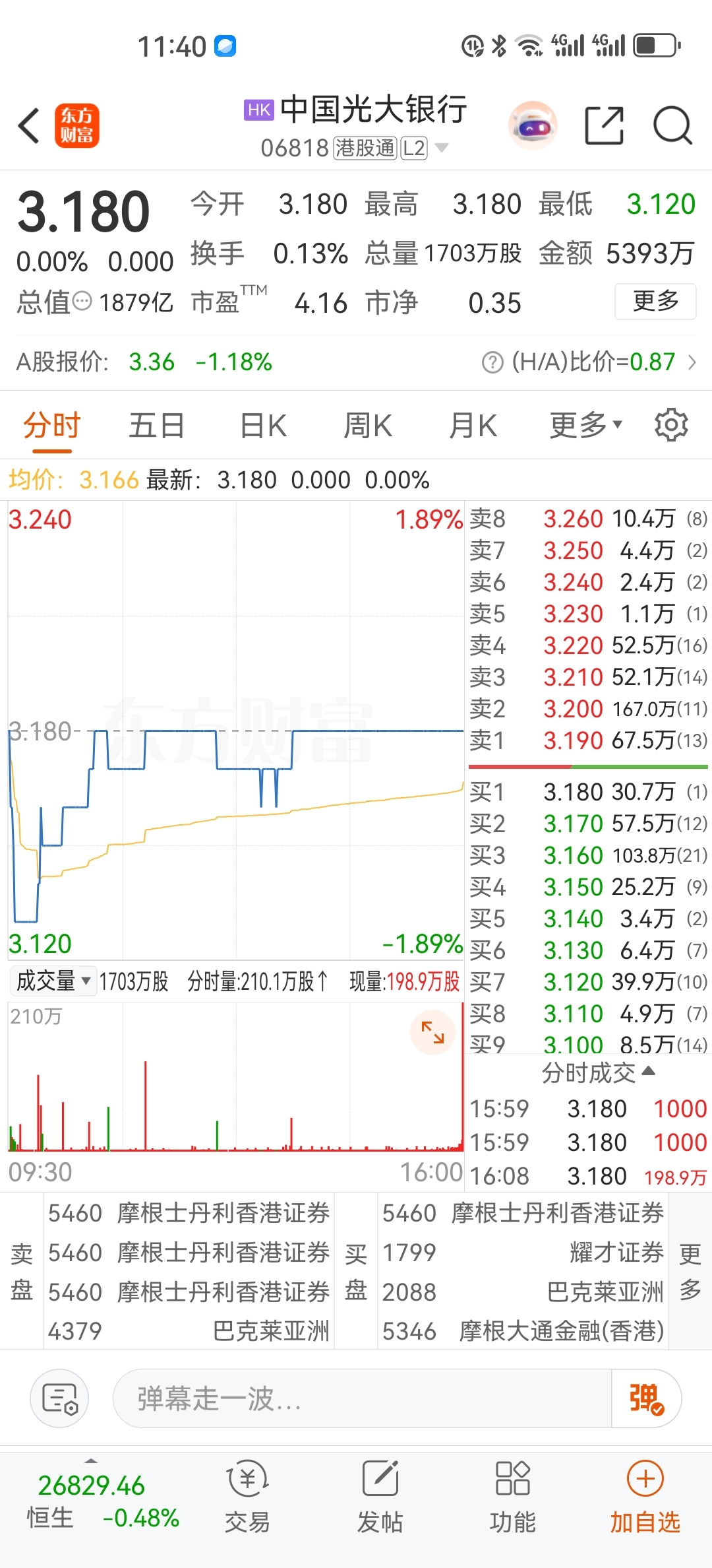 A股看不到交易方,H股能看到交易方。卖盘与买盘的第一位都是摩根士丹利香港证券。可