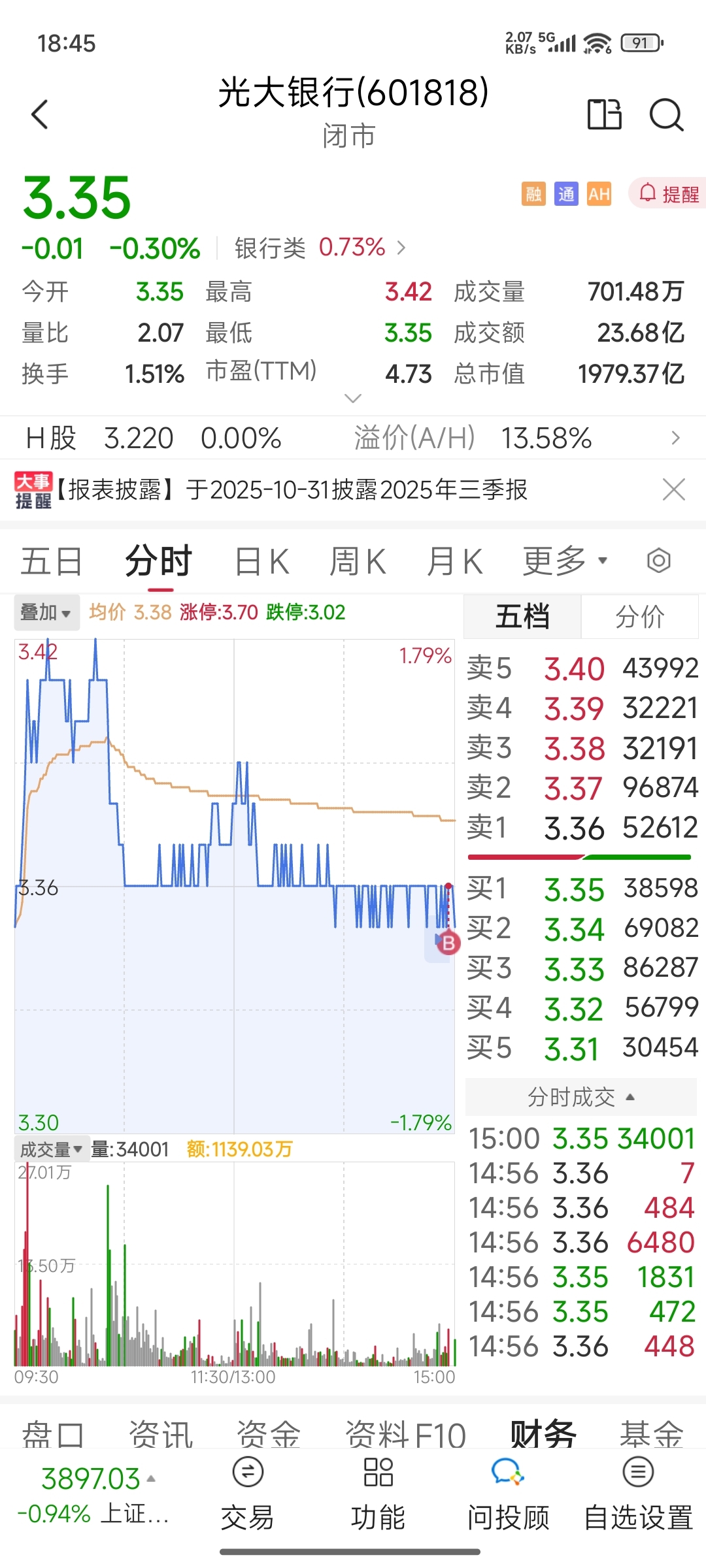 $光大银行(SH601818)$ 尾盘买了100股,又光又大。准备拿一年!等分红。