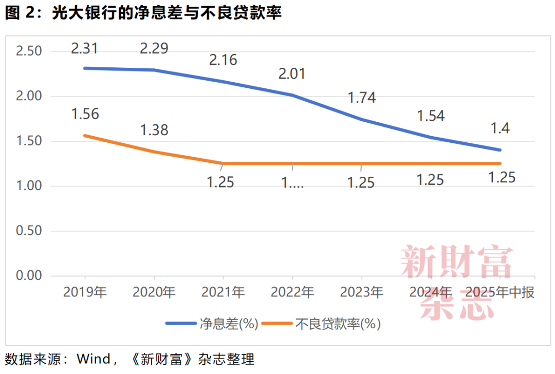 可以看到,近年来,光大银行的不良贷款率始终维持在1.25%,净息差则不断走低,与不良贷款率之间的空间不断缩小,2025年上半年,其净息差已跌至1.4%,与不良率之间的差值仅剩下0.15%(图2)。