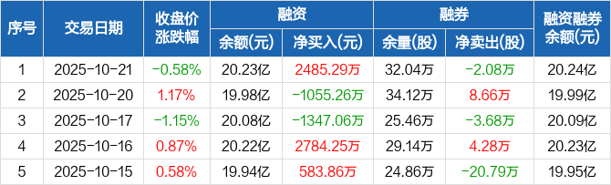 光大银行:融资净买入2485.29万元,融资余额20.23亿元(10-21)