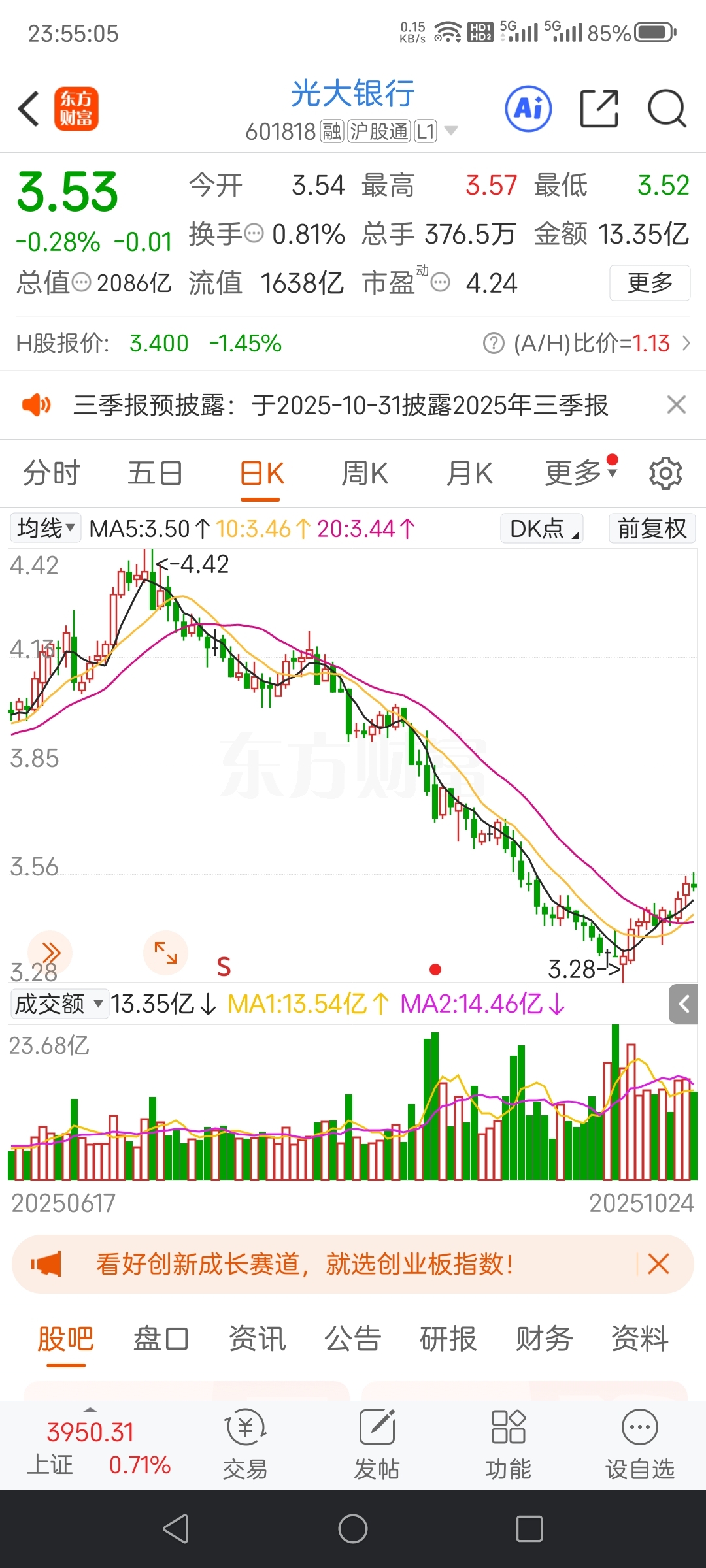 $光大银行(SH601818)$ 自从有幸待在了这里,现在都养成了很多良好的习惯,比如基本每天都吃面,吃面的时候自觉的关灯,因为环保,因为光大。