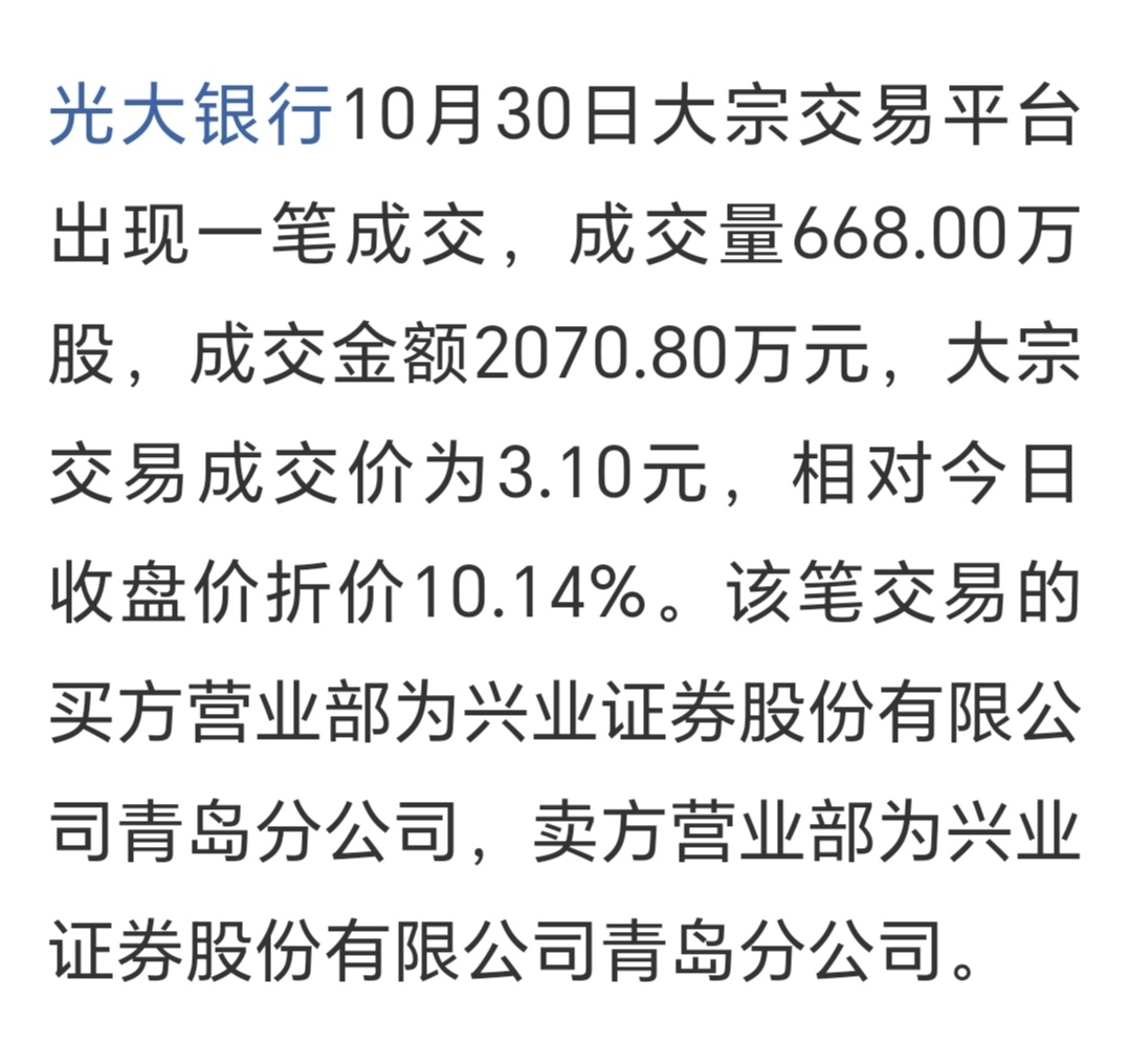 $光大银行(SH601818)$ 本月27日和30日两起大宗交易都是668万股有没有问题?!!!请老铁们评评