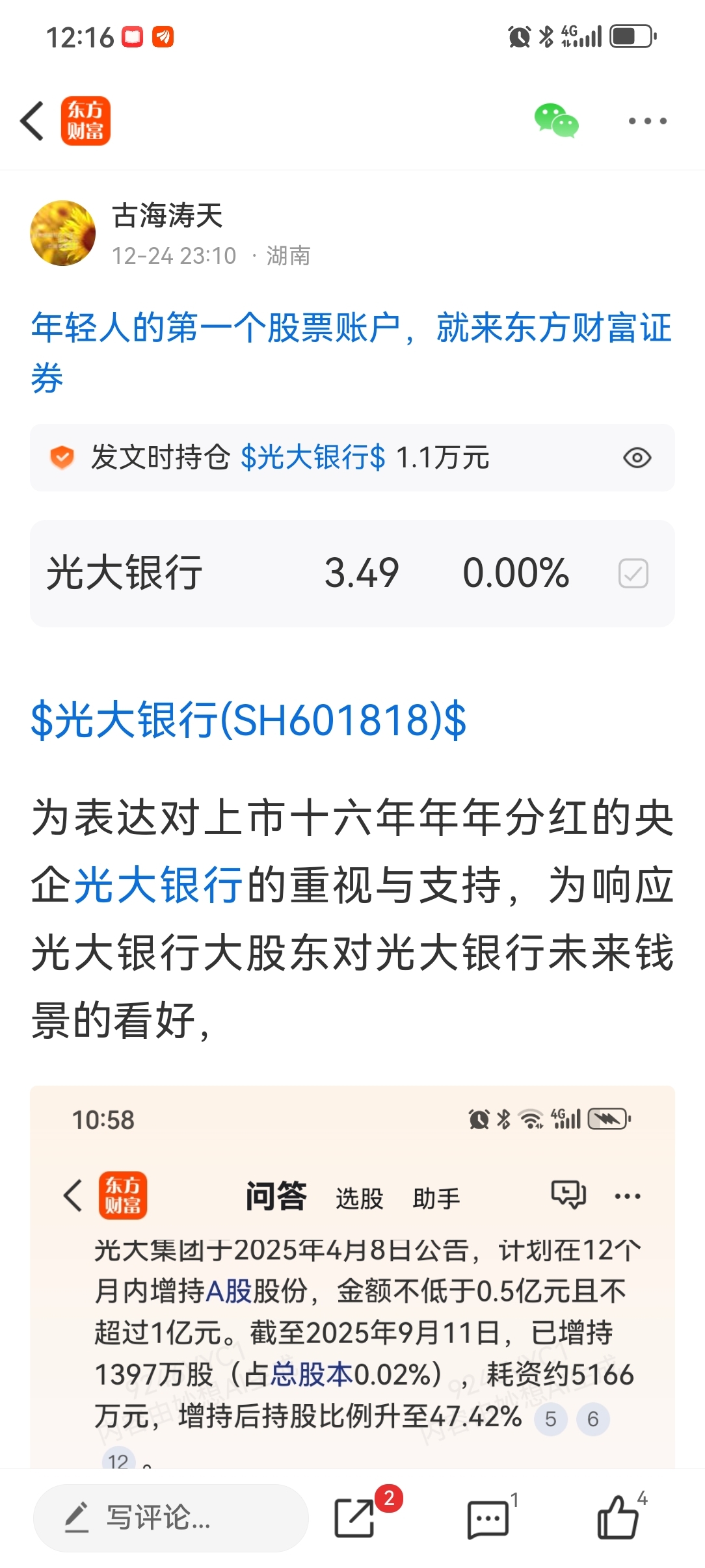 继2025年12月24日在光大银行吧公告增持计划后,增持一倍计划已完成,今天挂单