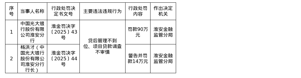 罚单显示,中国光大银行股份有限公司淮安分行的主要违法违规事实(案由)为:贷后管理不到位、项目贷款调查不审慎。