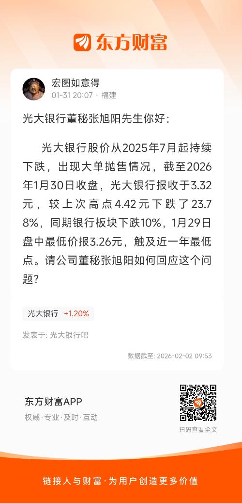 光大银行股价从2025年7月起持续下跌,出现大单抛售情况,截至2026年1月30日收盘,光大银行报收于3.32元,较上次高点4.42元下跌了23.78%,同期银行板块下跌10%,1月29日盘中最低价报3.26元,触及近一年最低点。请公司董秘张旭阳如何回应这个问题?