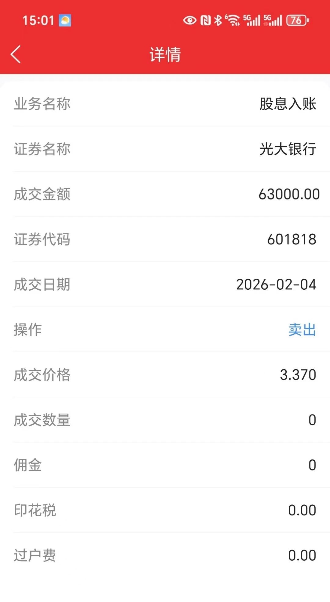 $XD光大银(SH601818)$ 分红到账取上点过年。今天两手准备,跌了用分红和融资补仓10万股。抢过几天的反弹,今天涨了,就把昨天抢权的10万3.33出了。减去0.021的税,等于多分了几千元。