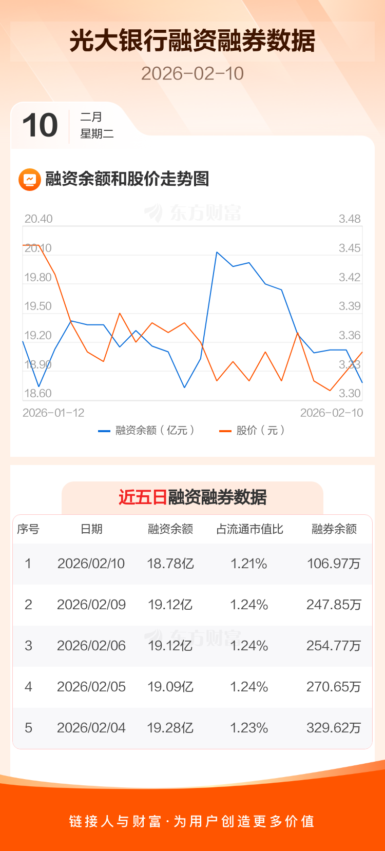 交易所最新数据显示,光大银行于2026年2月10日获融资买入1.07亿元,融资偿还1.42亿元,当日融资净偿还3456.44万元。目前,该股融资余额18.78亿,占流通市值比例为1.21%。