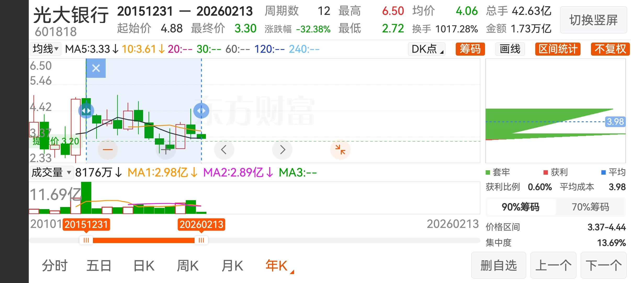 十二个年头了!光大银行自2015年见顶650分后已在下跌路上走了这么久…这十二年