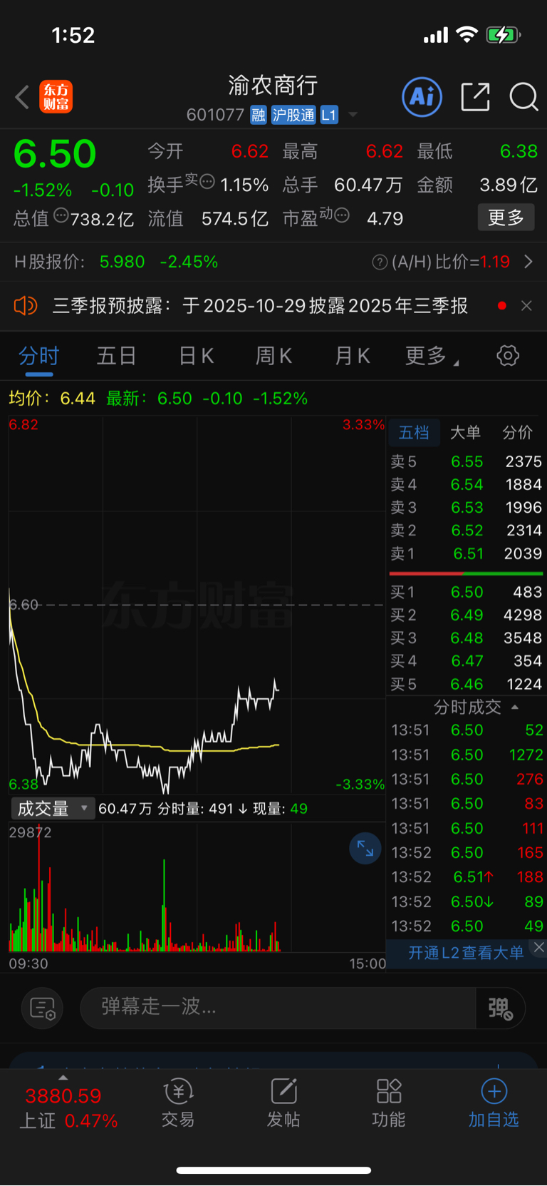 $沪农商行(SH601825)$ 人家都拉了。你现在倒数第一。 死垃鸡