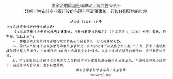 上海农商银行行长汪明任职资格获批