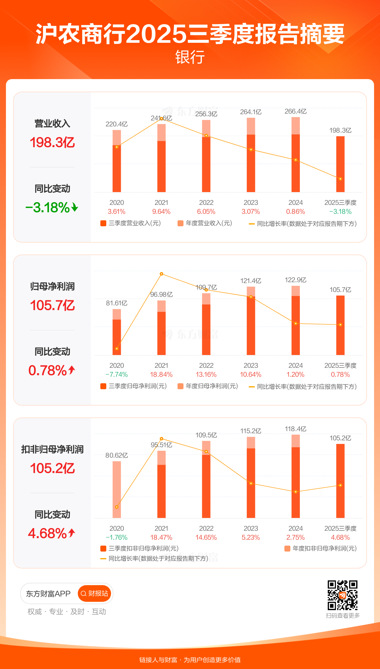 沪农商行10月31日发布2025年三季报显示,公司前三季实现营业收入198.31亿元,同比下滑3.18%;归母净利润105.67亿元,同比增长0.78%;扣非归母净利润105.17亿元,同比增长4.68%。