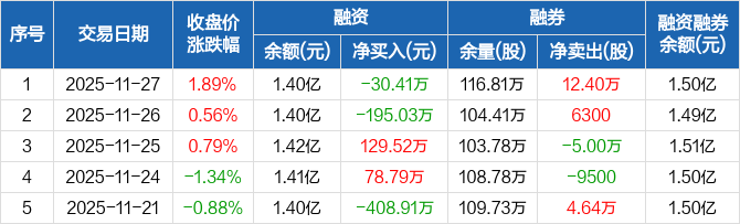 沪农商行:融资净偿还30.41万元,融资余额1.4亿元(11-27)