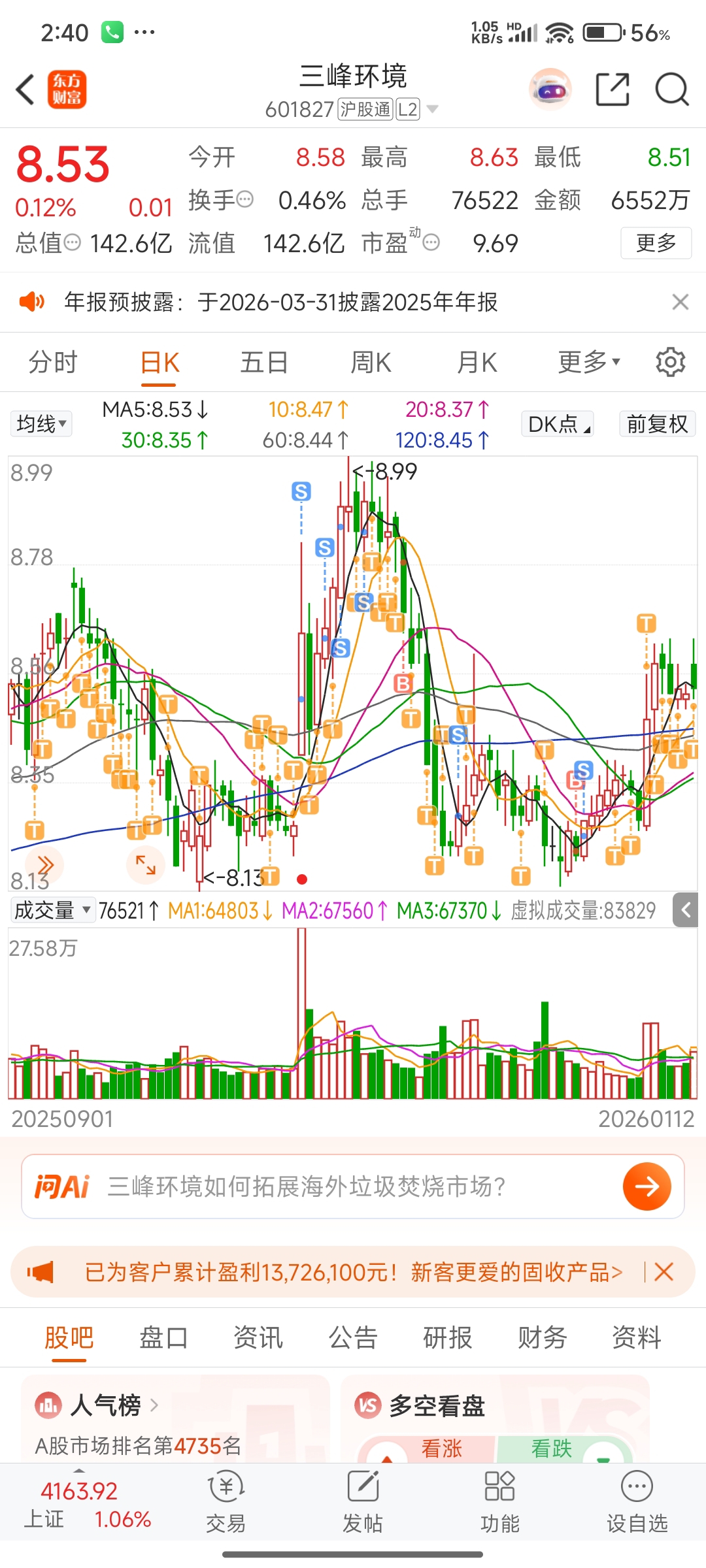 $三峰环境(SH601827)$ 庄家只有拉起来且连续大幅的涨,才能让我T飞,否则天天让我收几十几百元的差价