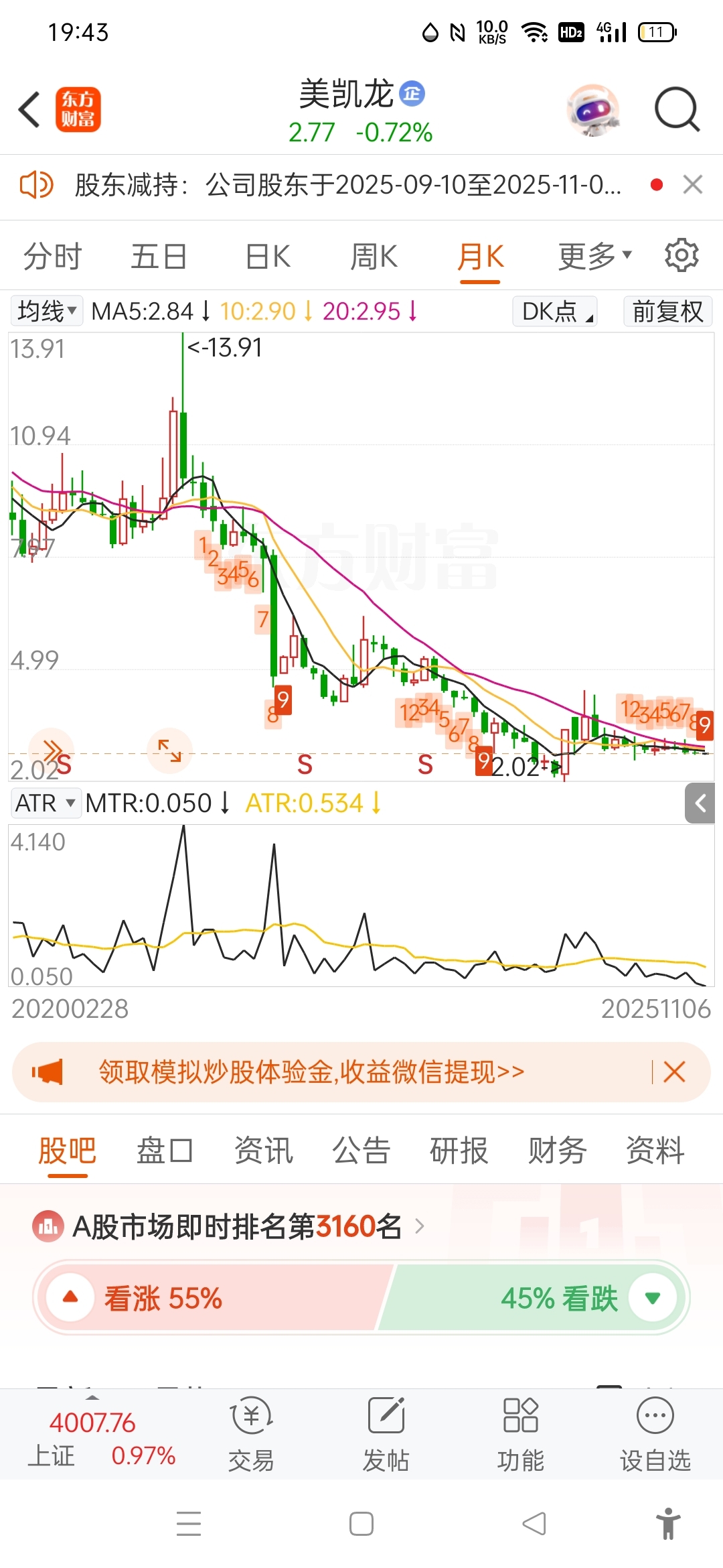 美凯伦月K己周9连阴,是机会与挑战并存。持有的不变,如再跌可重仓。我计划2元附近