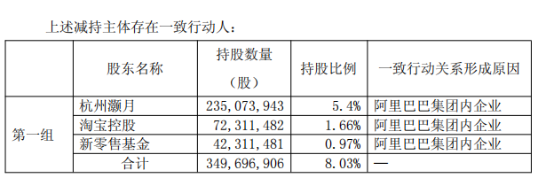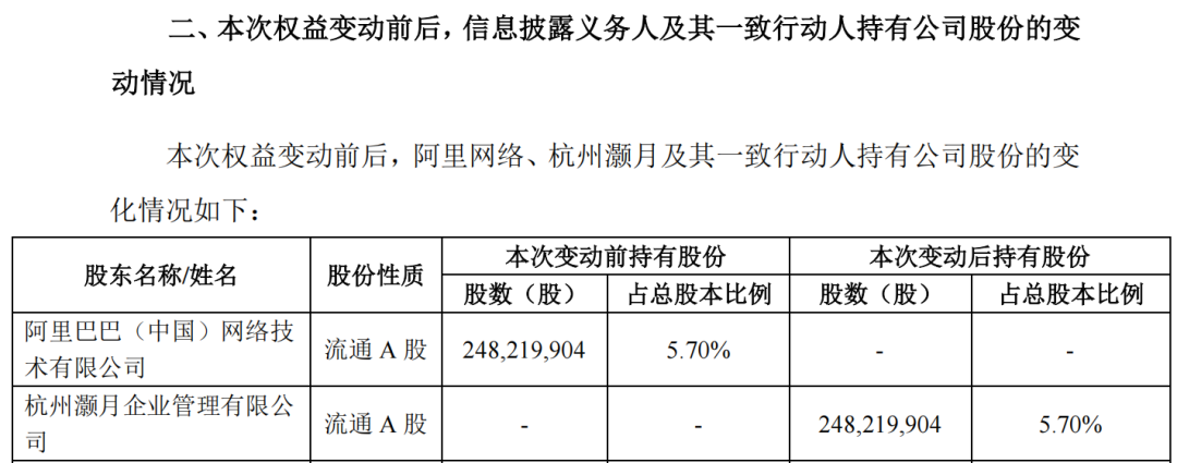 美凯龙2023年12月2日公告称,由于阿里巴巴(中国)网络技术有限公司实施存续分立,其所持公司2.48亿股股份(约占彼时公司总股本的5.70%)由分立后的新设公司杭州灏月获得。