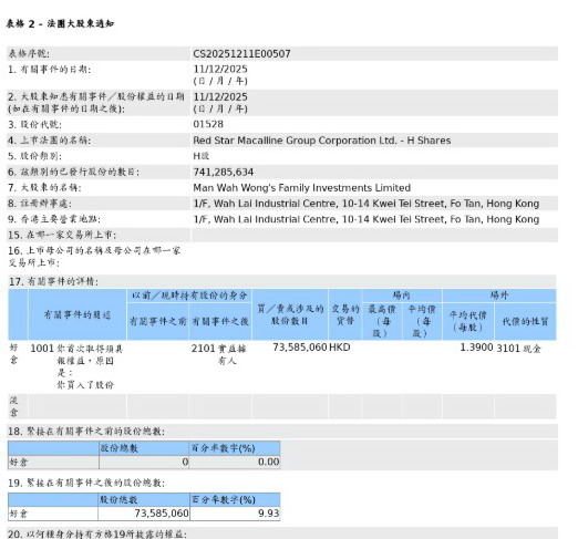 12月12日消息,根据香港联交所12月12日披露的文件,Man Wah Wong's Family Investments Limited于12月11日以每股均价1.39港元场外增持$红星美凯龙(HK|01528)$ 7,358.51万股H股股份,价值约1.02亿港元。增持后,Man Wah Wong's Family Investments Limited最新持股数目为7,358.51万股股份,好仓比例由0.00%升至9.93%。