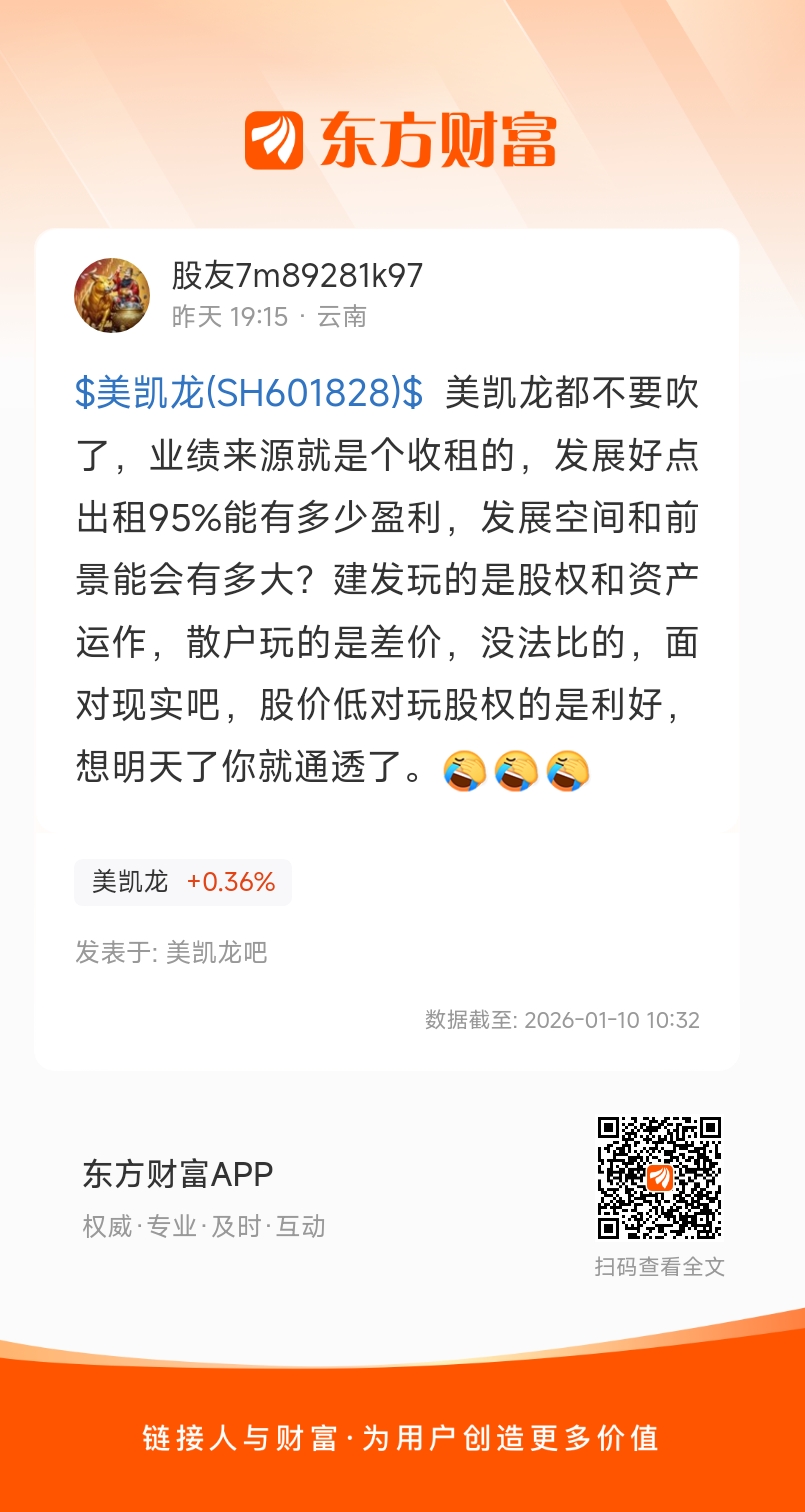 $美凯龙(SH601828)$ 美凯龙都不要吹了,业绩来源就是个收租的,发展好点出租95%能有多少盈利,发展空间和前景能会有多大?建发玩的是股权和资产运作,散户玩的是差价,没法比的,面对现实吧,股价低对玩股权的是利好,想明天了你就通透了。