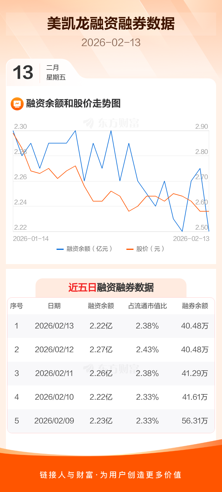 交易所最新数据显示,美凯龙于2026年2月13日获融资买入310.41万元,融资偿还853.07万元,当日融资净偿还542.65万元。目前,该股融资余额2.22亿,占流通市值比例为2.38%。