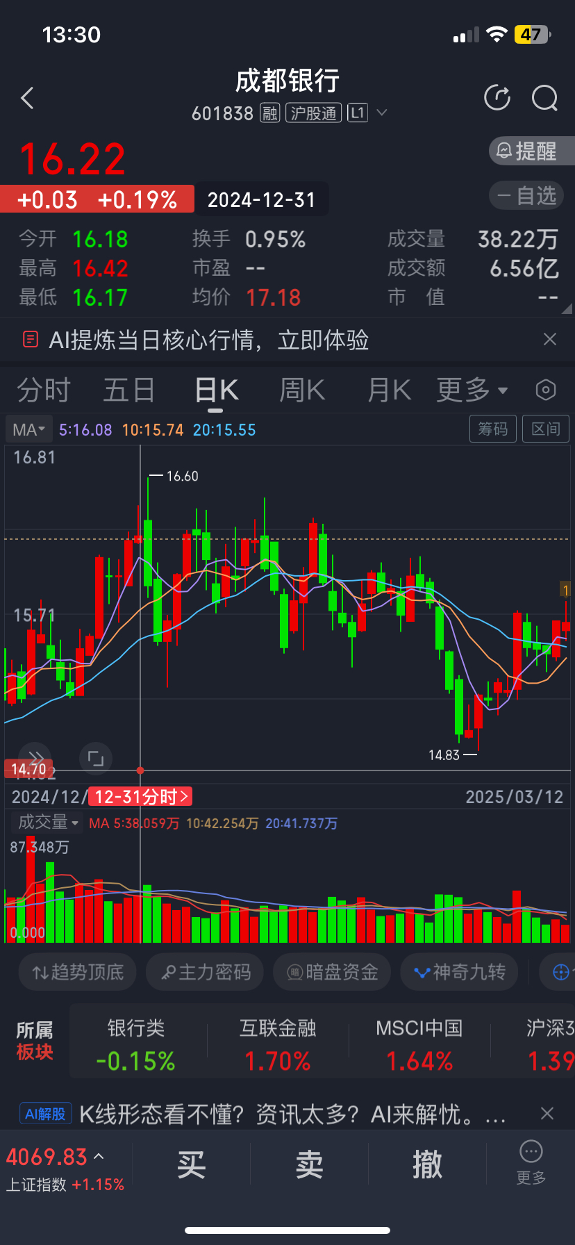 成都银行25年初16.22元、现在16.20元~一年就赚个分红、所以你们买银行有