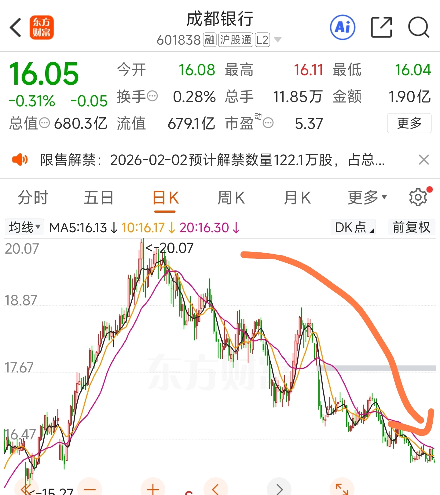 $成都银行(SH601838)$ 这个走势一路向下,从20元跌下来,已经跌去20%的市值了,这……,还是我认识的成都银行吗?