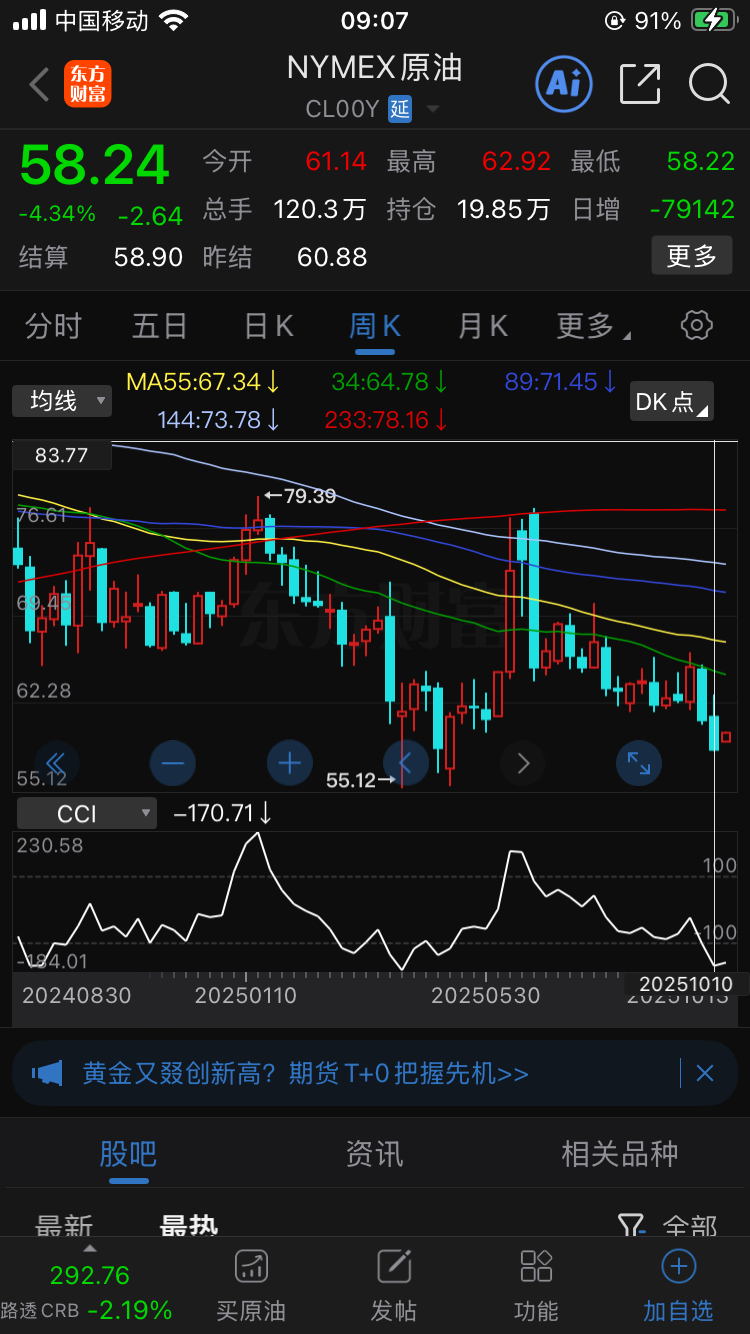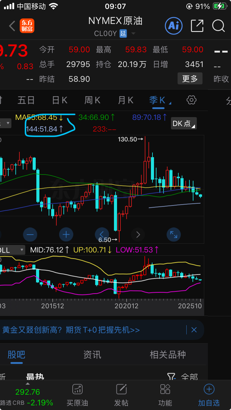 我的心情很沉重——国际油价趋向季线级别底裤均线过程中、周线级别上周断崖式进去-1