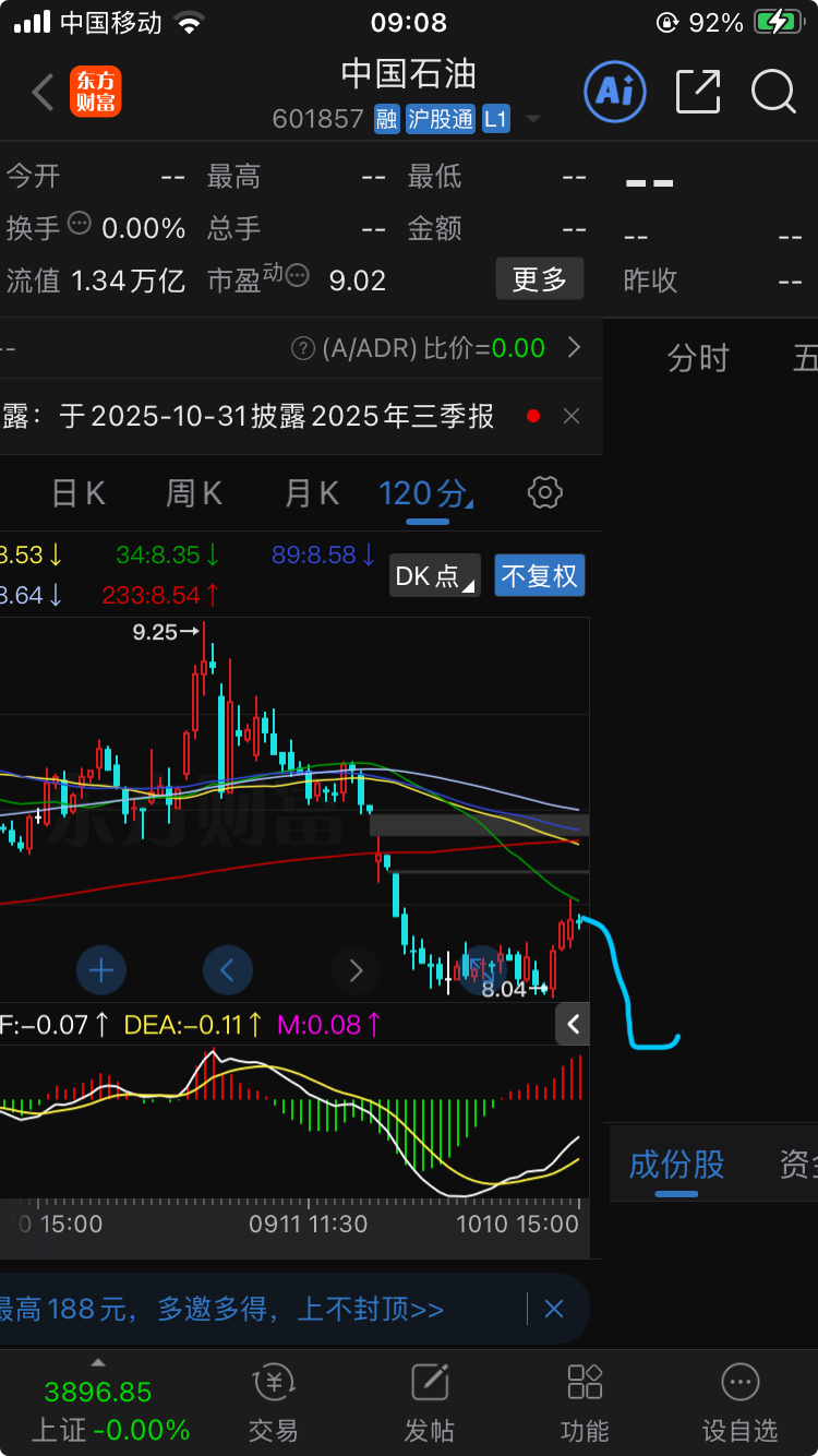 $中国石油(SH601857)$ 我的心情很沉重——国际油价趋向季线级别底裤均线过程中、周线级别上周断崖式进去-100以下的底部数值“区域”。中石油120分钟级别均线态势非常地不好,后续大概率新低不断,阶段性地完蛋中。