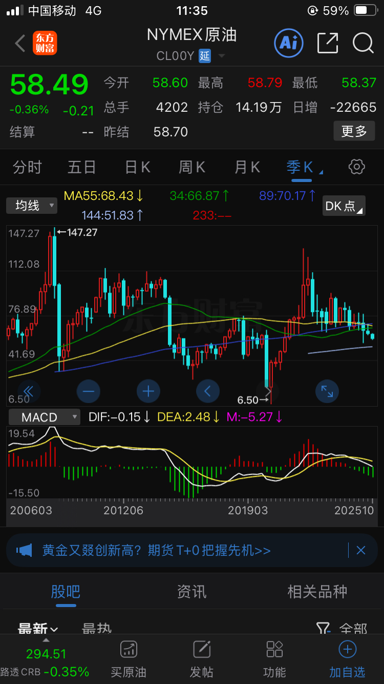 $中国石油(SH601857)$ 近几个交易日的这波拉升,是60分钟级别M型下跌中继反弹的概率较大——国际油价日线级别均线全部向下发散中,并未显现筑底态势;要说大底,从其季线图看,淡蓝色均线所在的52美元上下,才是最牢靠的,因为具我的观察,一条按时间累积出的新均线,往往在不太长的时间内就会被用到。