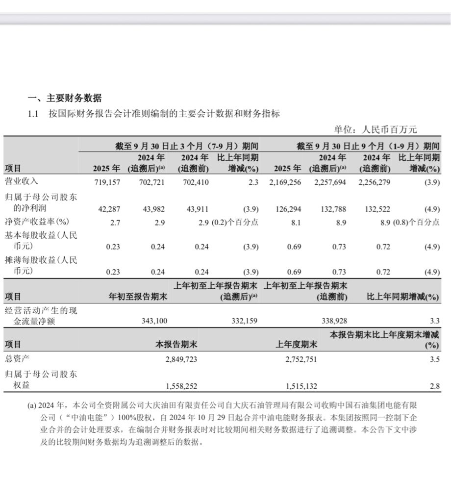 $中国石油(SH601857)$ 2025年3季度实现营收2.2万亿元;归母净利润1263亿元,同比-4.9%(比2季度都有所好转)
