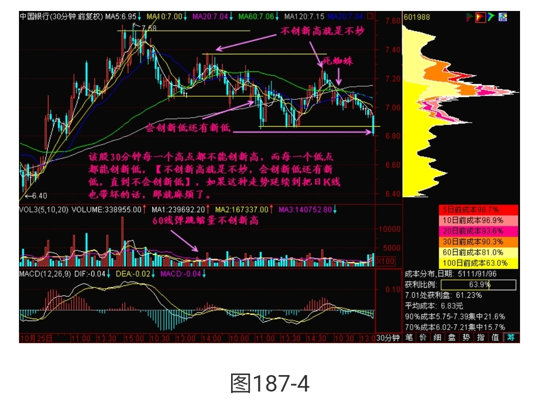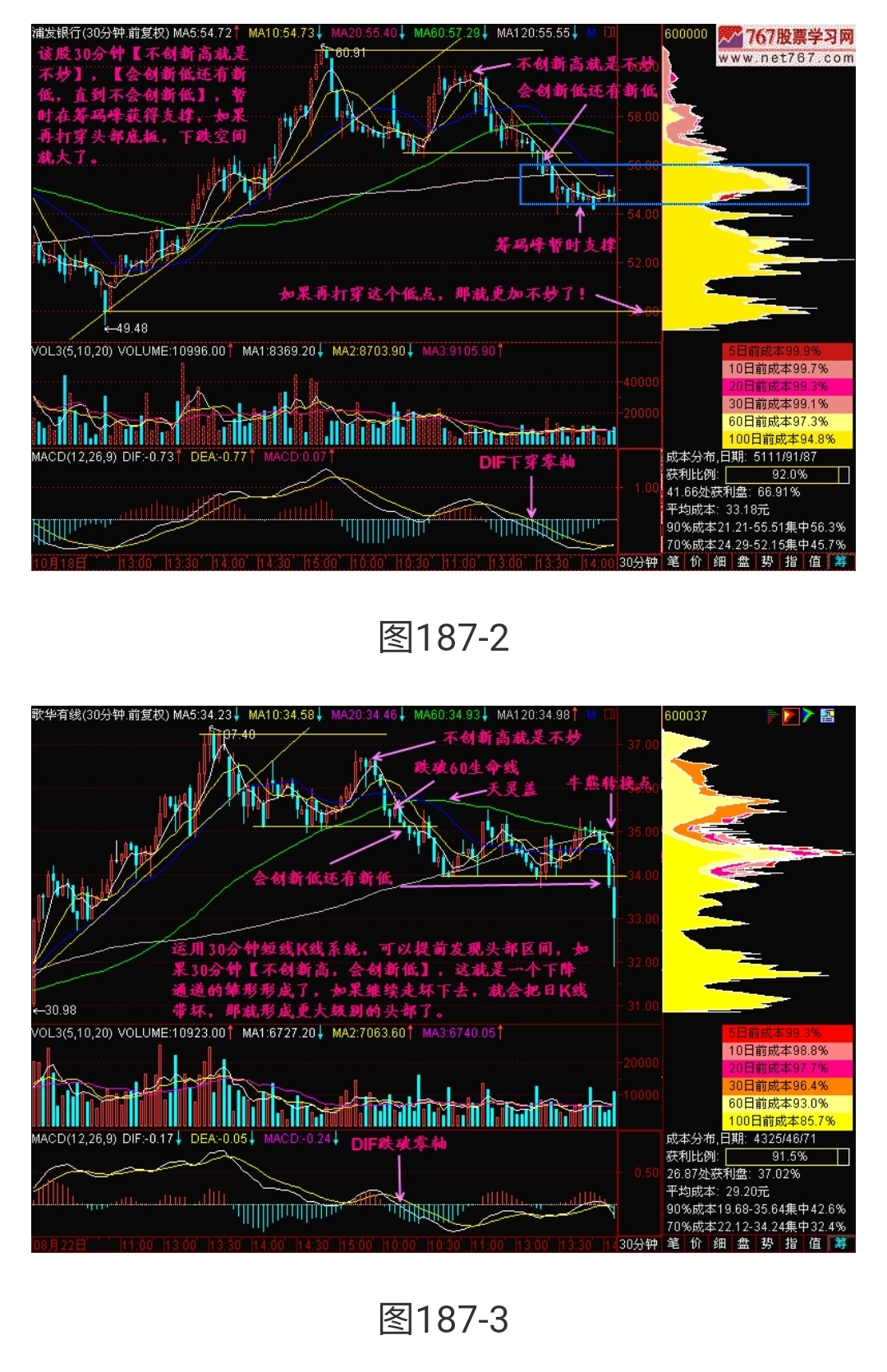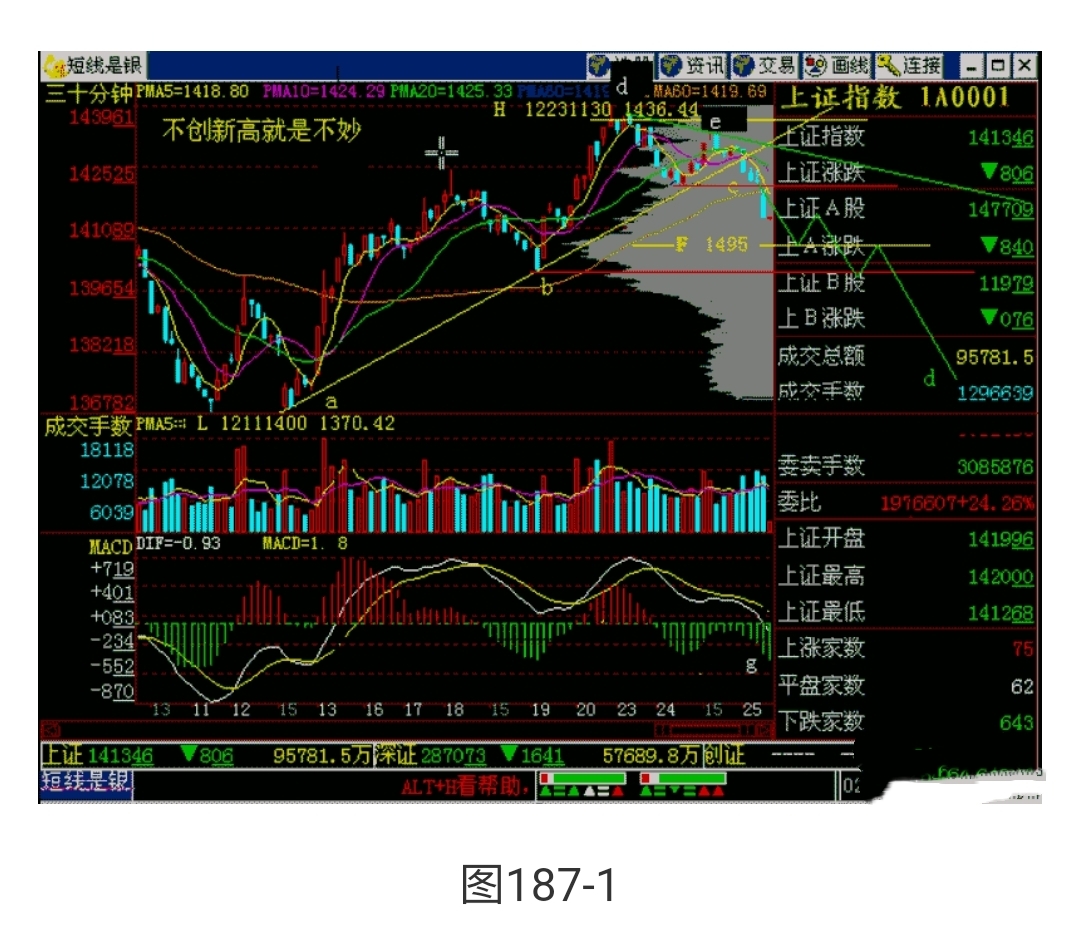 这几天指数走得比较关键,所以我们就用30分钟这种比较敏感的短线K线来观察它。我们发现它在e点没有创新高,【不创新高就死不妙】。见(图187-1)所示。