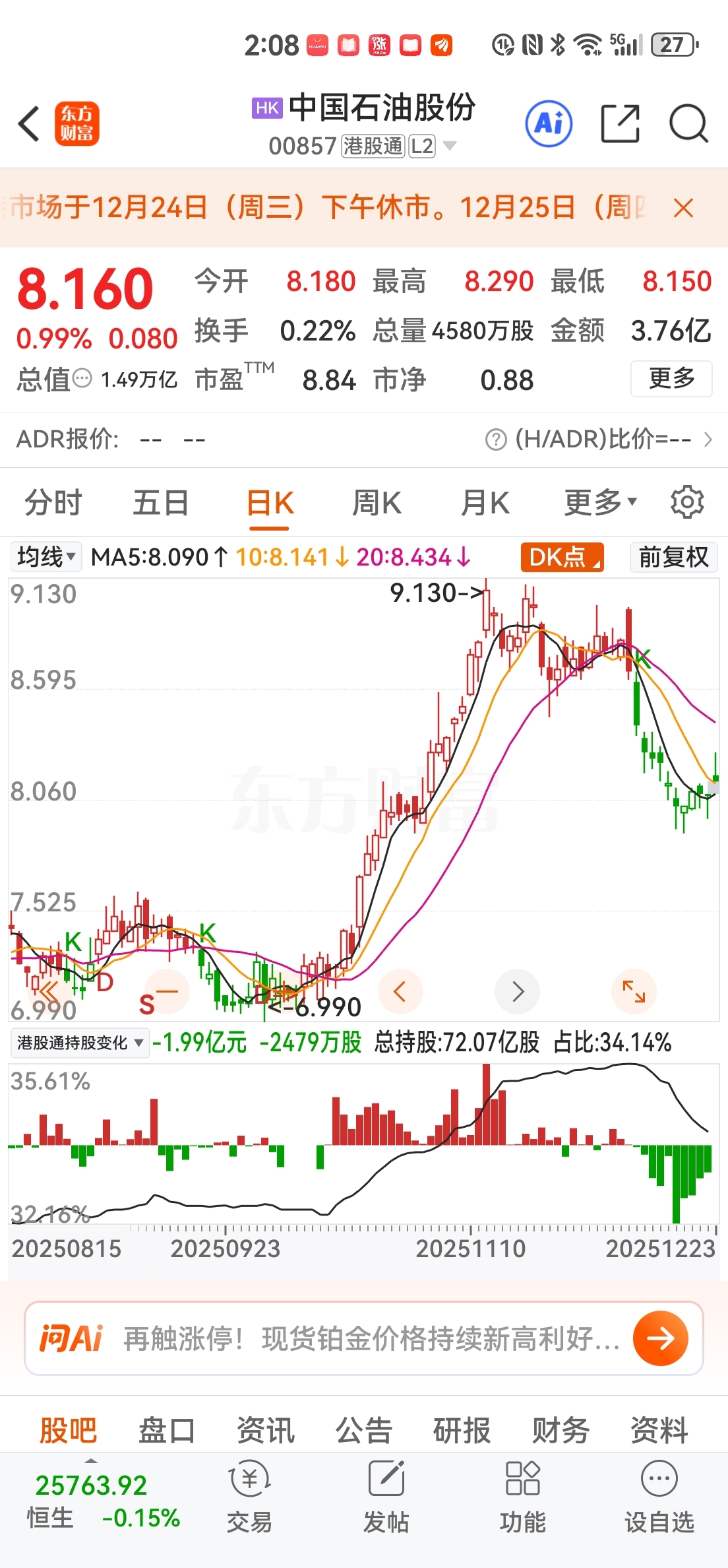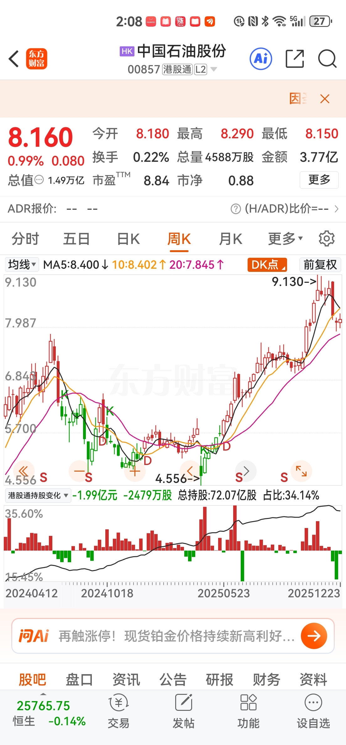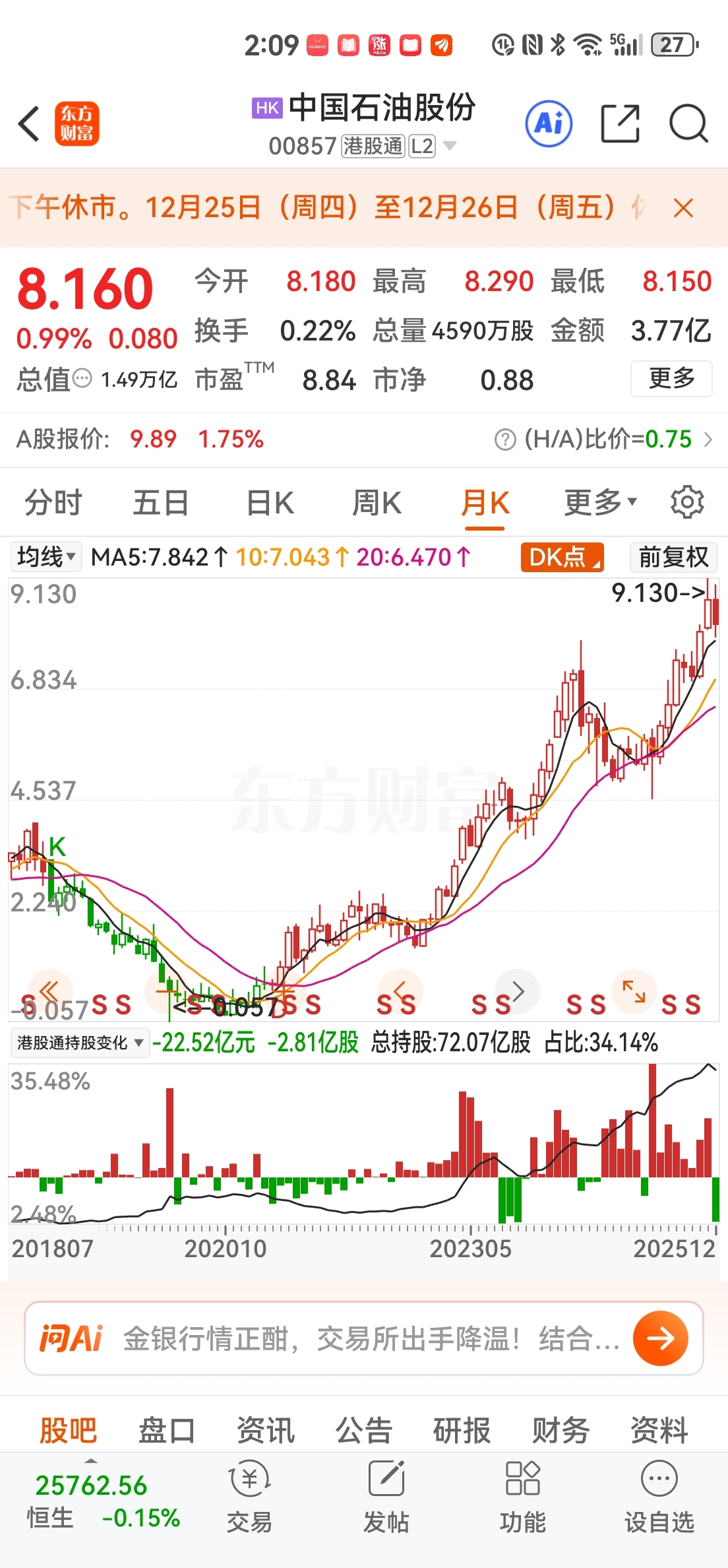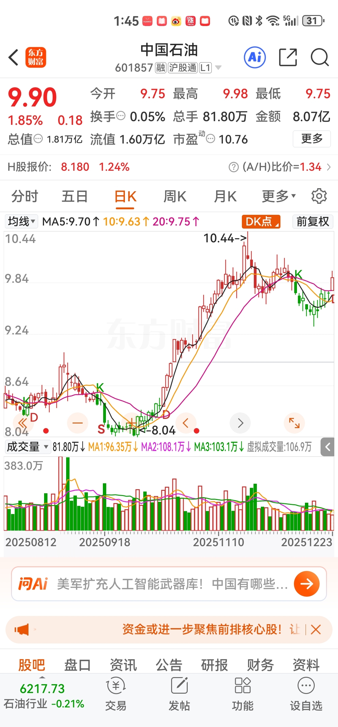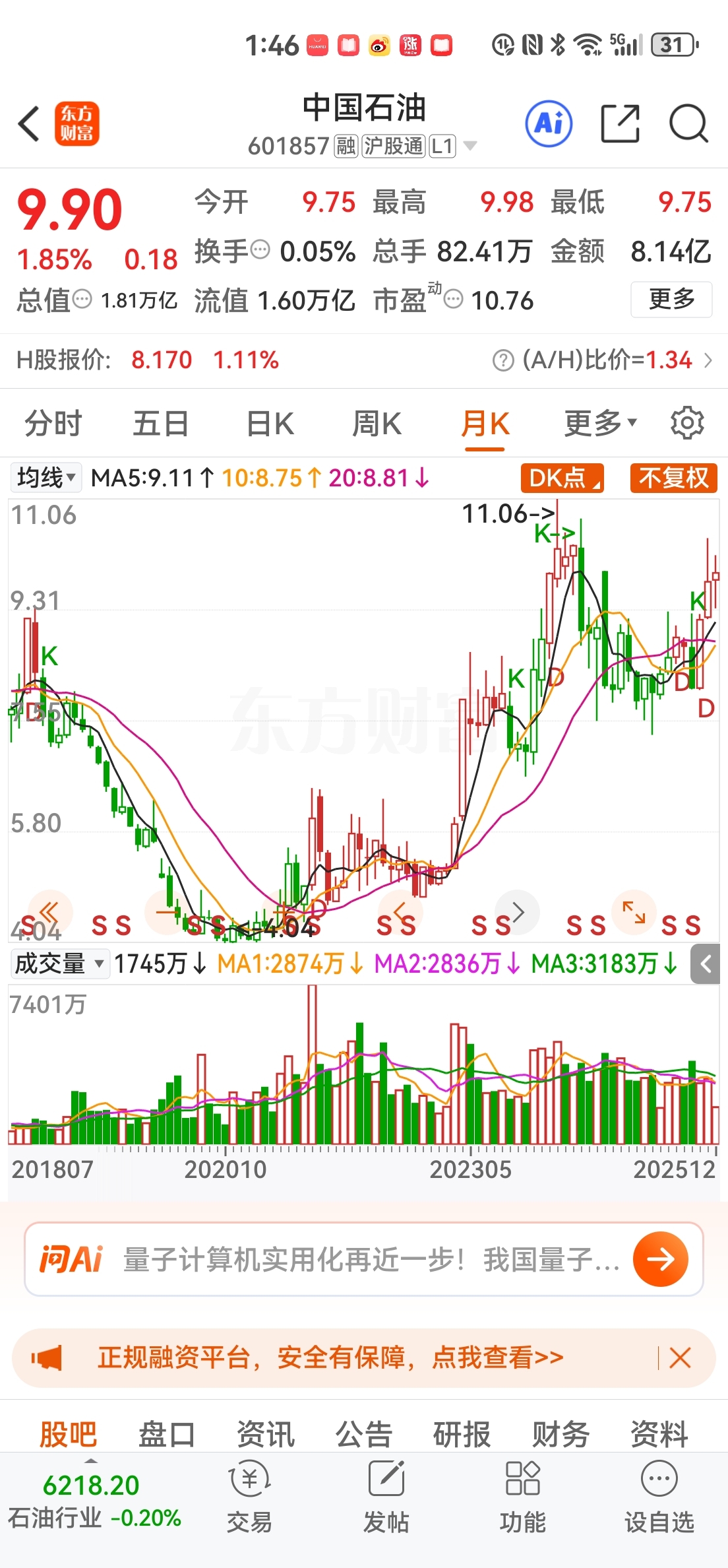 中石油再现9块9。中石油H816。问君能有几多愁,恰似踏空中石油。
