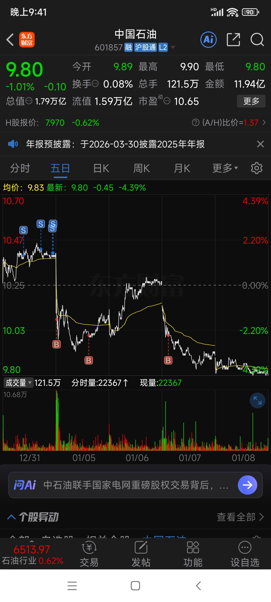 $中国石油(SH601857)$ 今天在鹭燕打板板,忘了没买,明天再买一笔。