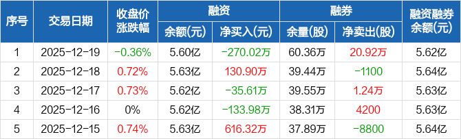 紫金银行:融资净偿还270.02万元,融资余额5.6亿元(12-19)