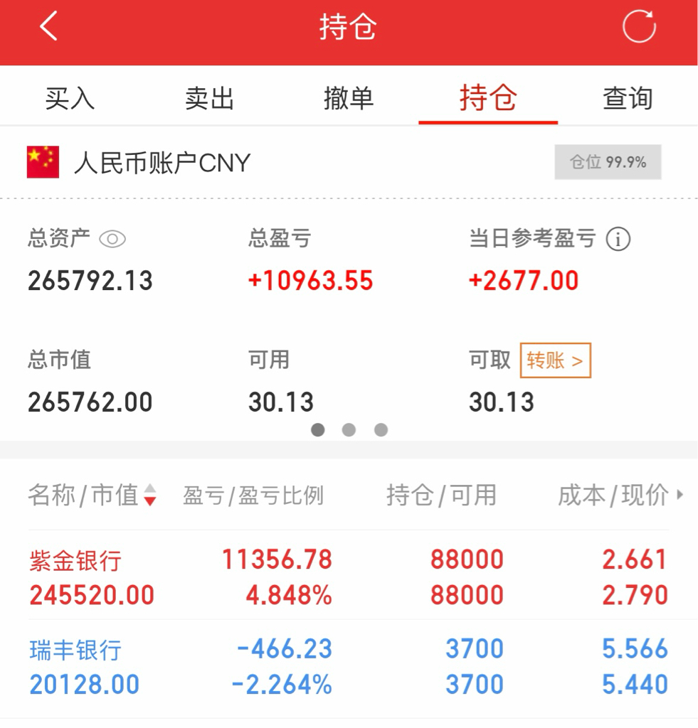 $紫金银行(SH601860)$ 还有2天2月份结束了!这票不慌不忙的,都没填权。按这速度,6月分红也在2.85附近!持有4年了,他不着急,我也不着急!反正都这样了,破罐子破摔,大不了都不赚钱。我同事都翻倍了,心态放平。爱谁赚谁赚!