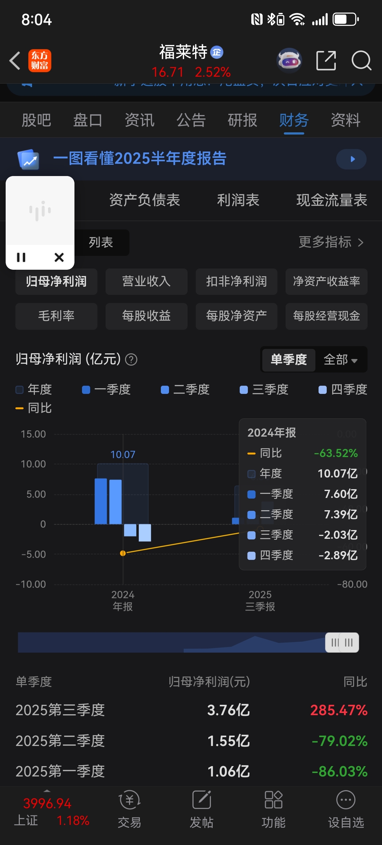 去年三季度亏2.04亿,今年三季度挣3.76亿。你报告来个同比下降284%!做报