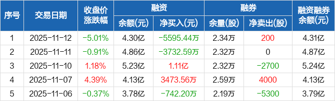 福莱特:融资净偿还5595.44万元,融资余额4.3亿元(11-12)
