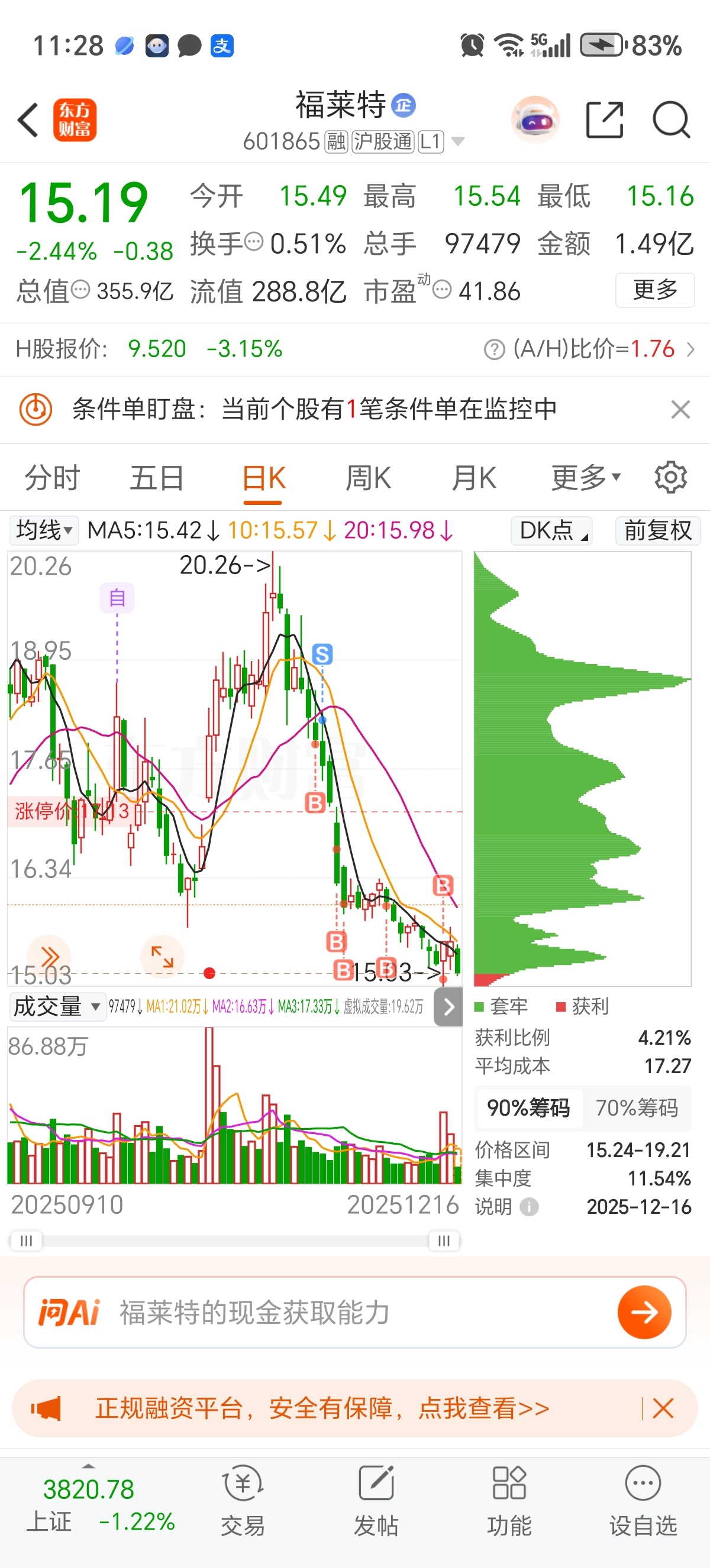 $福莱特(SH601865)$ 跌的有气无力的我的买法就是跌7%补100股 择机加一点 这个跌法我没感觉