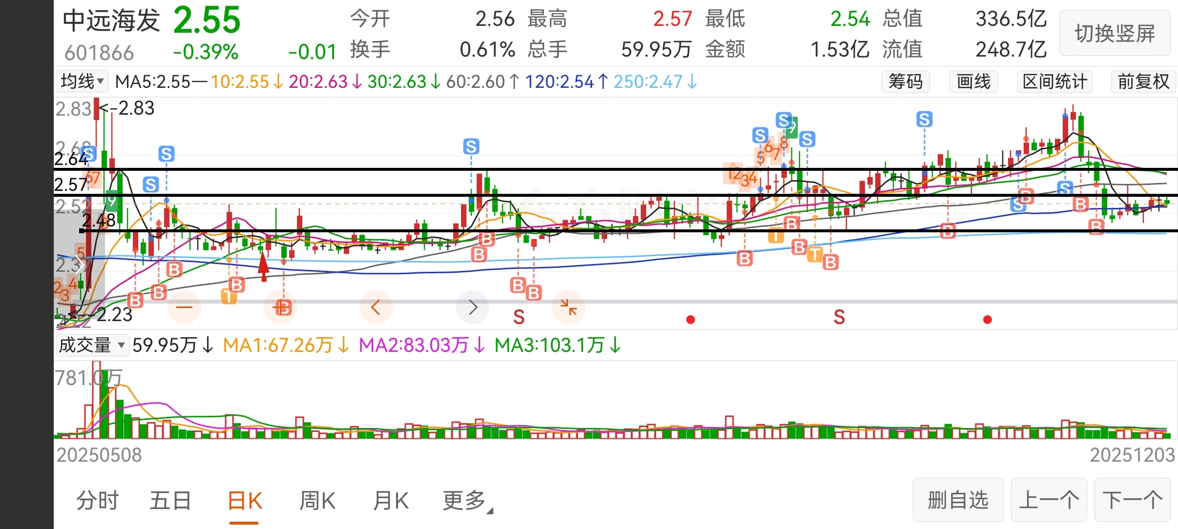 $中远海发(SH601866)$ 2.57压力位,看看能否突破进入到上一个箱体(2.57-2.64)