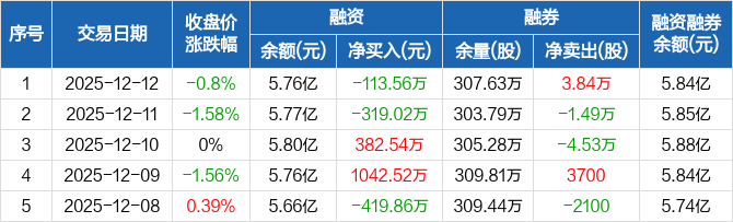 中远海发:融资净偿还113.56万元,融资余额5.76亿元(12-12)