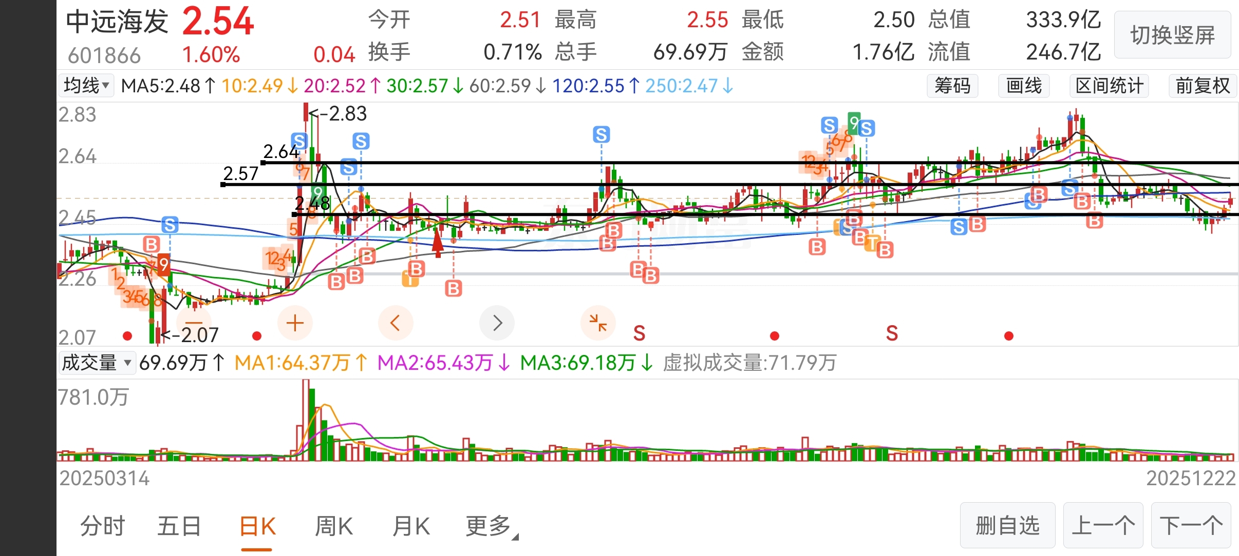 $中远海发(SH601866)$ 箱体压力位,依次为2.57,2.64,应该不能一下就上去吧,月底能收到2.57就行,今年不涨不跌。